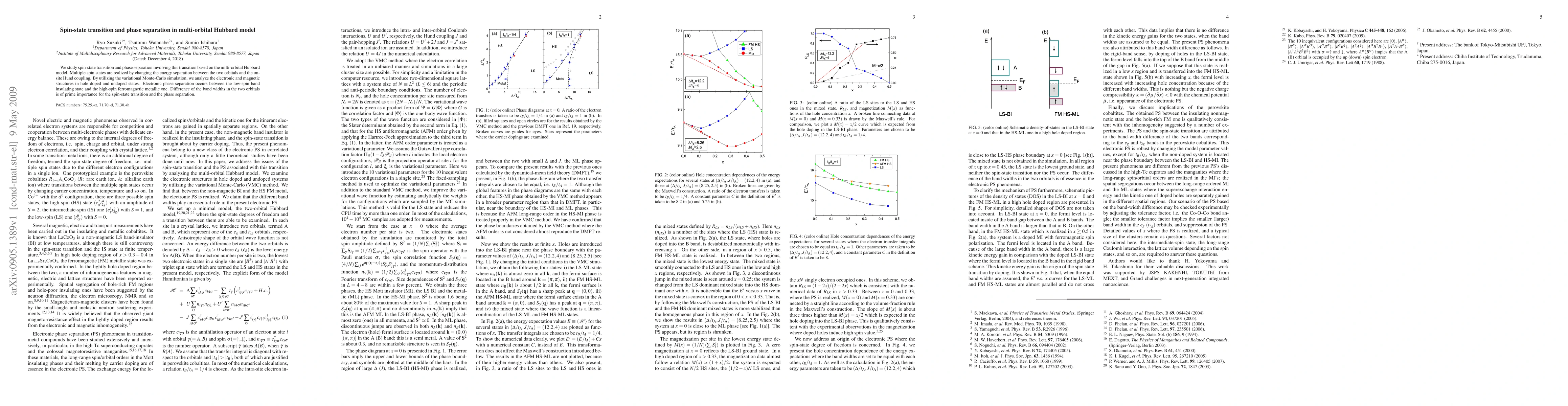 We study spin-state transition and phase separation involving this transition based on the milti-orbital Hubbard model. Multiple spin states are realized by changing the energy separation between the two orbitals and the on-site Hund coupling. By utilizing the variational Monte-Carlo simulation, we analyze the electronic and magnetic structures in hole doped and undoped states. Electronic phase separation occurs between the low-spin band insulating state and the high-spin ferromagnetic metallic one. Difference of the band widths in the two orbitals is of prime importance for the spin-state transition and the phase separation.
