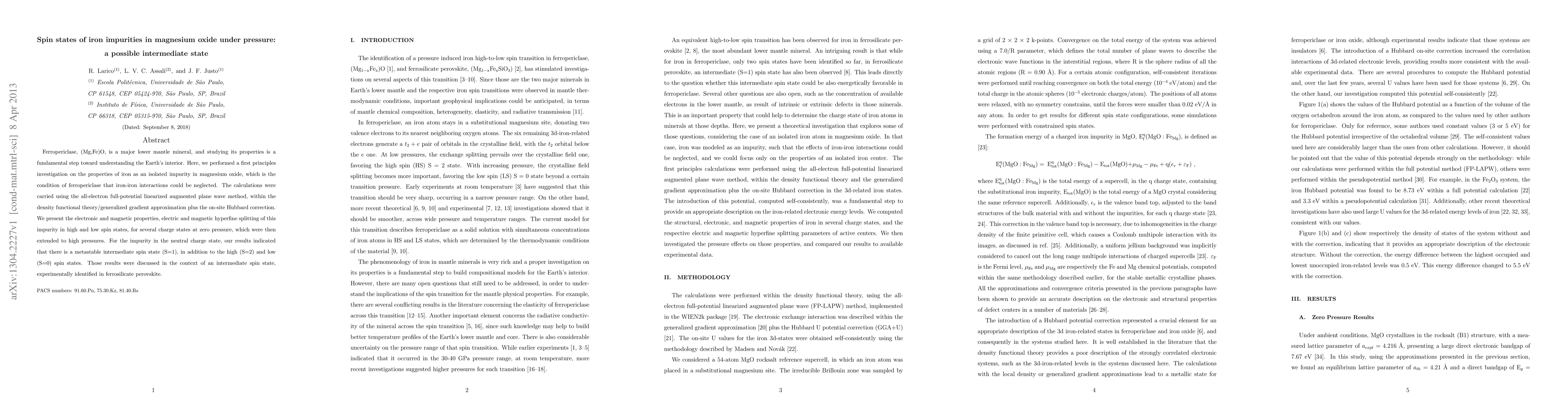 Ferropericlase (Mg,Fe)O is a major lower mantle mineral, and studying its properties is a fundamental step toward understanding the Earth's interior. Here, we performed a first-principles investigation on the properties of iron as an isolated impurity in magnesium oxide, which is the condition of ferropericlase under which iron-iron interactions could be neglected. The calculations were carried using the all-electron full-potential linearized augmented plane wave method within the density functional theory in the generalized gradient approximation plus the on-site Hubbard correction. We present the electronic and magnetic properties, electric and magnetic hyperfine splitting of this impurity in high and low spin states for several charge states at zero pressure, which were then extended to high pressures. For the impurity in the neutral charge state, our results indicated that there is a metastable intermediate spin state (S=1), in addition to the high (S=2) and low (S=0) spin states. Those results were discussed in the context of an intermediate spin state, experimentally identified in ferrosilicate perovskite.