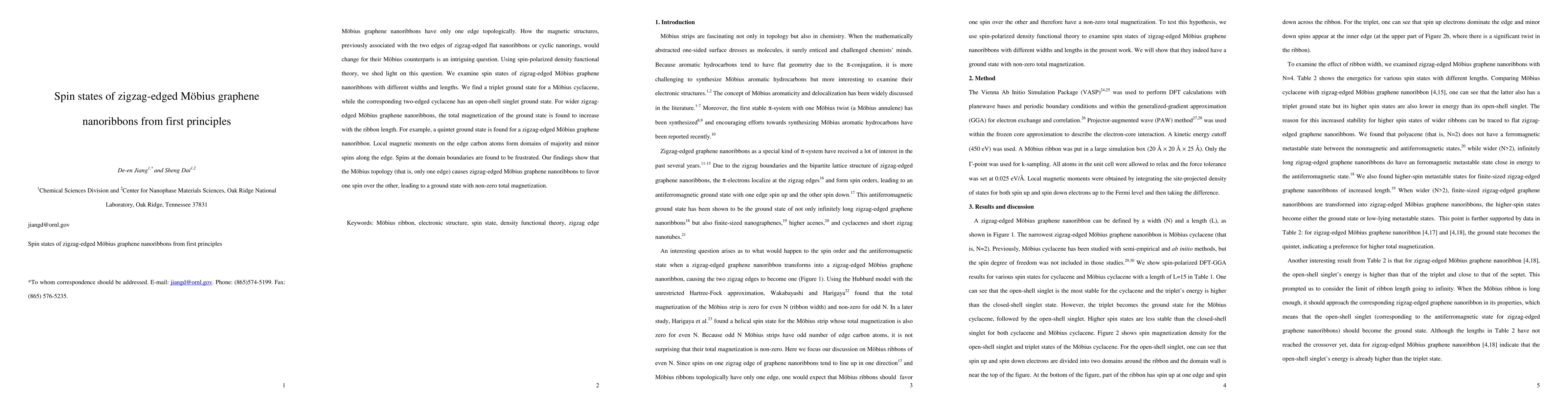 Mobius graphene nanoribbons have only one edge topologically. How the magnetic structures, previously associated with the two edges of zigzag-edged flat nanoribbons or cyclic nanorings, would change for their Mobius counterparts is an intriguing question. Using spin-polarized density functional theory, we shed light on this question. We examine spin states of zigzag-edged Mobius graphene nanoribbons (ZMGNRs) with different widths and lengths. We find a triplet ground state for a Mobius cyclacene, while the corresponding two-edged cyclacene has an open-shell singlet ground state. For wider ZMGNRs, the total magnetization of the ground state is found to increase with the ribbon length. For example, a quintet ground state is found for a ZMGNR. Local magnetic moments on the edge carbon atoms form domains of majority and minor spins along the edge. Spins at the domain boundaries are found to be frustrated. Our findings show that the Mobius topology (i.e., only one edge) causes ZMGNRs to favor one spin over the other, leading to a ground state with non-zero total magnetization.
