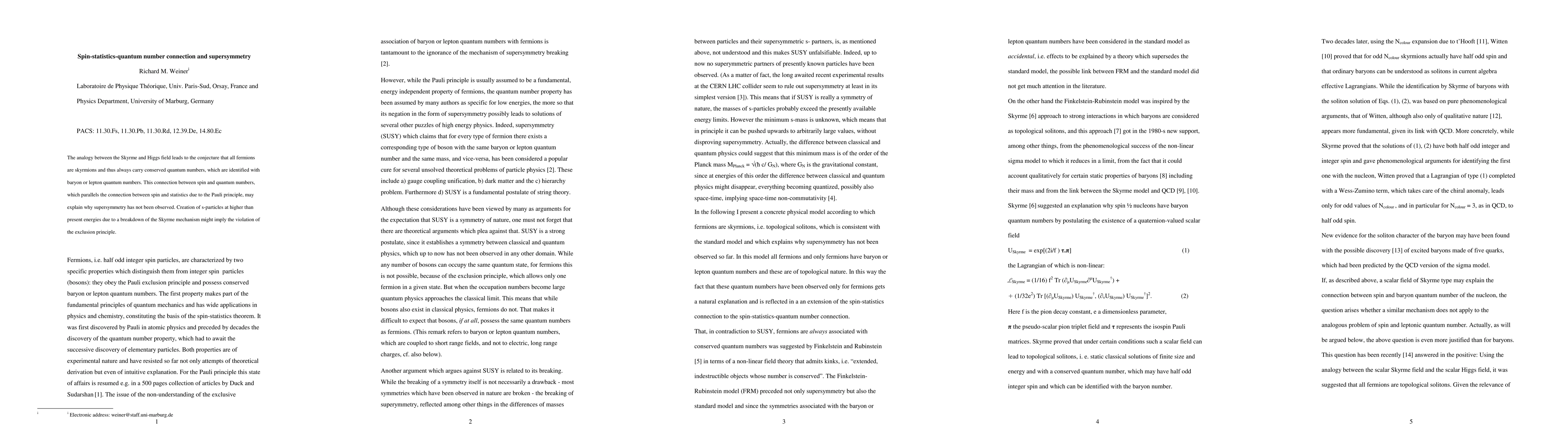 The analogy between the Skyrme and Higgs field leads to the conjecture that all fermions are skyrmions and thus always carry conserved quantum numbers, which are identified with baryon or lepton quantum numbers. This connection between spin and quantum numbers, which parallels the connection between spin and statistics due to the Pauli principle, may explain why supersymmetry has not been observed. Creation of s-particles at higher than present energies due to a breakdown of the Skyrme mechanism might imply the violation of the exclusion principle.