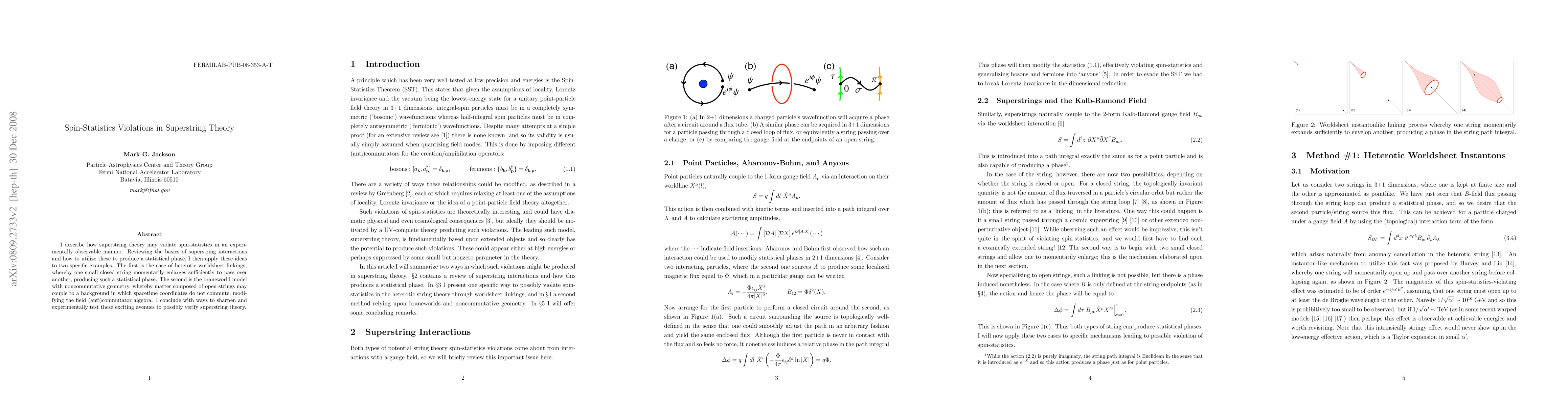 I describe how superstring theory may violate spin-statistics in an experimentally observable manner. Reviewing the basics of superstring interactions and how to utilize these to produce a statistical phase, I then apply these ideas to two specific examples. The first is the case of heterotic worldsheet linkings, whereby one small closed string momentarily enlarges sufficiently to pass over another, producing such a statistical phase. The second is the braneworld model with noncommutative geometry, whereby matter composed of open strings may couple to a background in which spacetime coordinates do not commute, modifying the field (anti)commutator algebra. I conclude with ways to sharpen and experimentally test these exciting avenues to possibly verify superstring theory.
