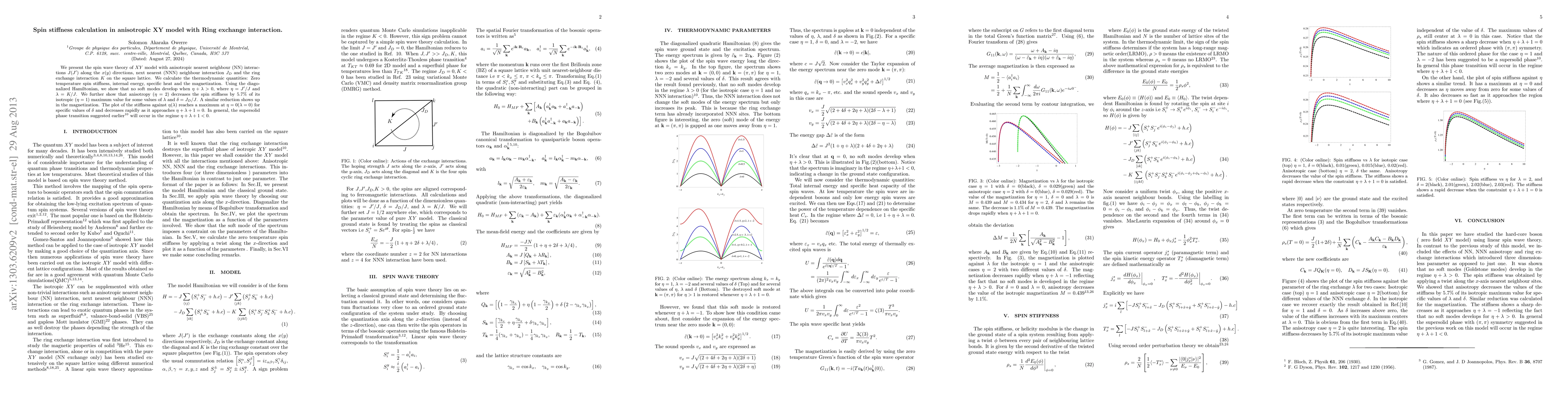 This research applies spin wave theory to an XY model with anisotropic NN interactions, NNN interaction, and ring exchange on a square lattice. Key findings include no soft modes for u03bd + u03be > 0, reduced spin stiffness and magnetization due to anisotropy, and a suggested supersolid phase transition regime when u03bd + u03be + 1 < 0.