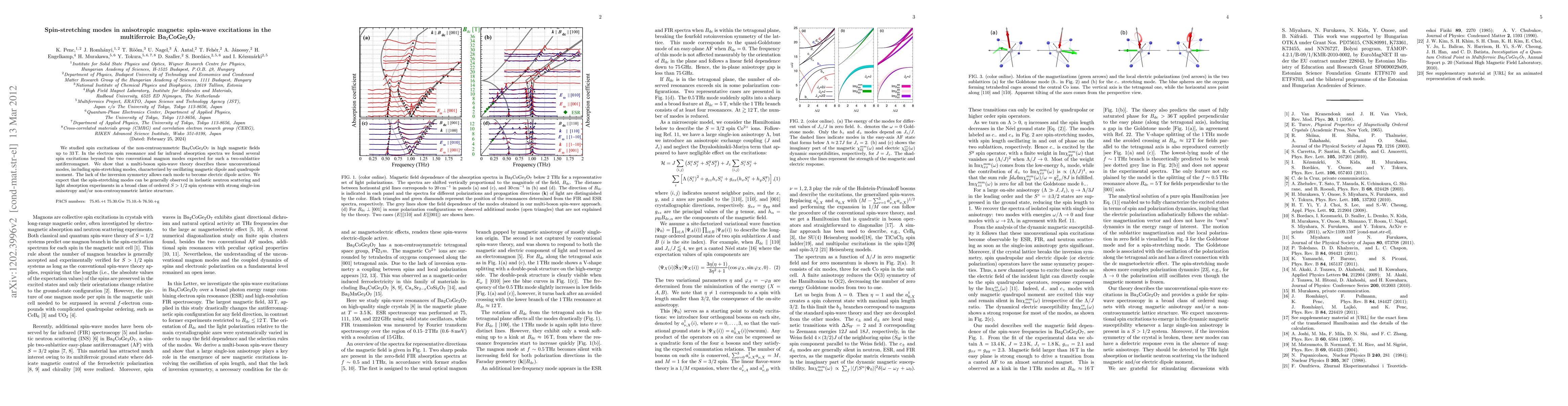 We studied spin excitations of the multiferroic Ba2CoGe2O7 in high magnetic fields up to 33 T. In the electron spin resonance and far infrared absorption spectra we found several spin excitations beyond the two conventional magnon modes expected for such a two-sublattice antiferromagnet. We show that a multi-boson spin-wave theory can capture these unconventional modes, that include spin-stretching modes associated with an oscillating magnetic dipole (or only quadrupole) moment. The lack of the inversion symmetry allows these modes to become electric dipole active. We expect that the spin-stretching modes can be generally observed in inelastic neutron scattering and light absorption experiments in a broad class of ordered S > 1/2 spin systems with strong single-ion anisotropy and/or non-centrosymmetric lattice structure.