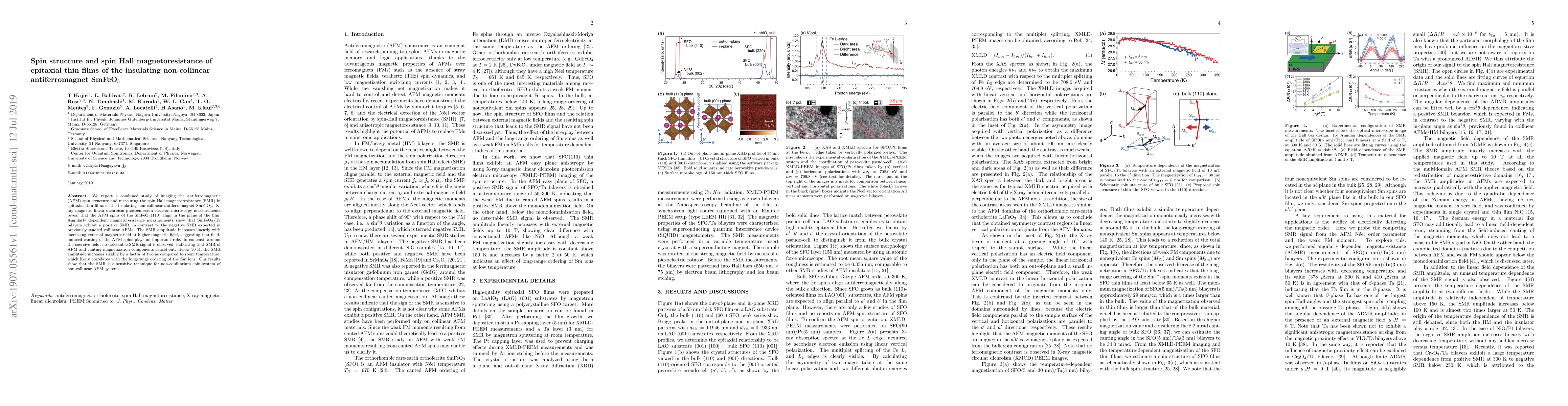 We report a combined study of imaging the antiferromagnetic (AFM) spin structure and measuring the spin Hall magnetoresistance (SMR) in epitaxial thin films of the insulating non-collinear antiferromagnet SmFeO$_3$. X-ray magnetic linear dichroism photoemission electron microscopy measurements reveal that the AFM spins of the SmFeO$_3$(110) align in the plane of the film. Angularly dependent magnetoresistance measurements show that SmFeO$_3$/Ta bilayers exhibit a positive SMR, in contrast to the negative SMR expected in previously studied collinear AFMs. The SMR amplitude increases linearly with increasing external magnetic field at higher magnetic field, suggesting that field-induced canting of the AFM spins plays an important role. In contrast, around the coercive field, no detectable SMR signal is observed, indicating that SMR of AFM and canting magnetization components cancel out. Below 50~K, the SMR amplitude increases sizably by a factor of two as compared to room temperature, which likely correlates with the long-range ordering of the Sm ions. Our results show that the SMR is a sensitive technique for non-equilibrium spin system of non-collinear AFM systems.