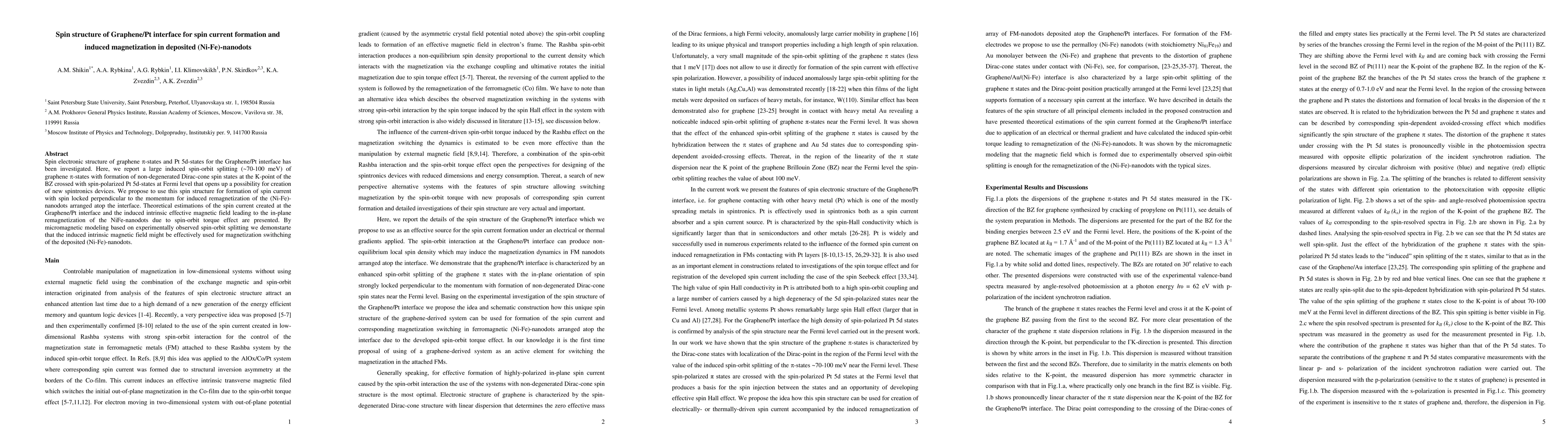 This study investigates the spin electronic structure at the Graphene/Pt interface, revealing significant spin-orbit splitting and non-degenerate Dirac-cone spin states, which enable the creation of spin currents. These spin currents can induce magnetization in deposited (Ni-Fe) nanodots, facilitating potential advancements in spintronics technology.