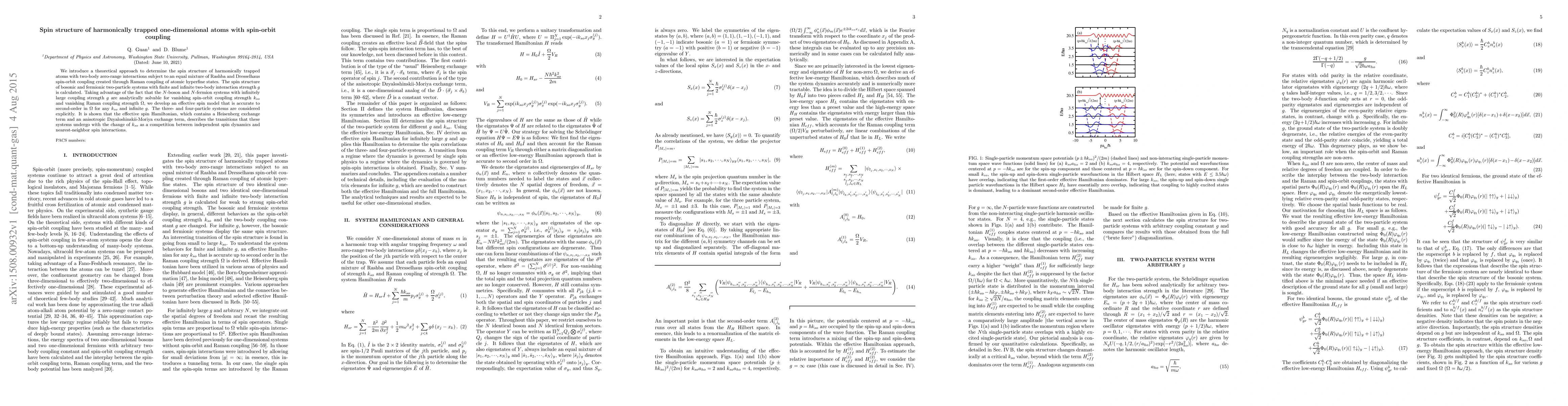 This paper develops a theoretical framework to analyze the spin structure of harmonically trapped one-dimensional atoms with spin-orbit coupling, focusing on bosonic and fermionic two-particle systems. It introduces an effective spin model that accurately describes the spin dynamics and transitions under varying spin-orbit coupling strengths, revealing a competition between independent spin dynamics and nearest-neighbor interactions.