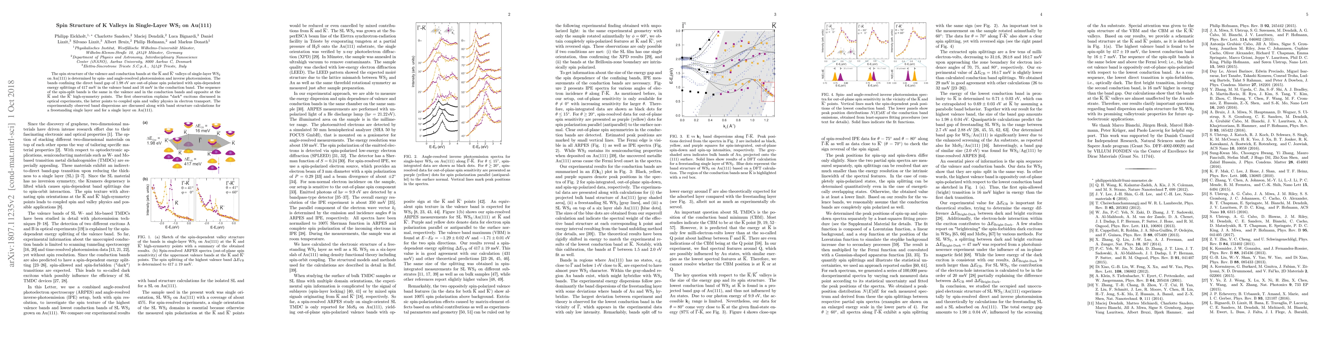 This study reveals the spin structure of the $\overline{\text{K}}$ and $\overline{\text{K}}'$ valleys in single-layer WS$_2$ on Au(111) via spin- and angle-resolved photoemission, showing out-of-plane spin polarization and spin-dependent energy splittings, which provide insights into "dark" excitons and coupled spin-valley physics in electron transport.