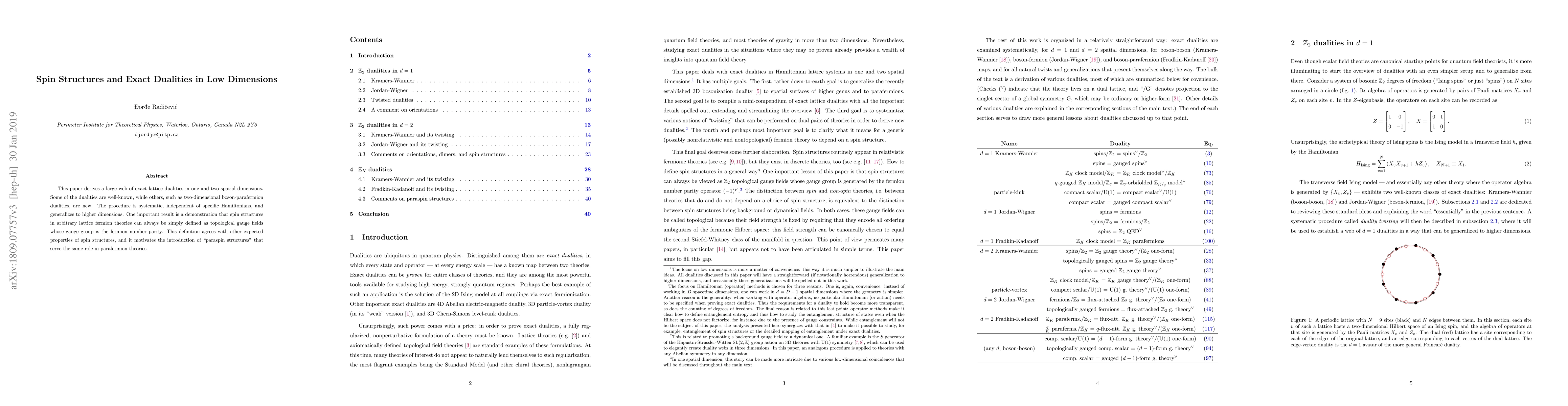 This paper systematically derives a network of exact lattice dualities in one and two dimensions, introducing new dualities like two-dimensional boson-parafermion dualities. It also defines spin structures in lattice fermion theories as topological gauge fields based on fermion number parity, and introduces "paraspin structures" for parafermion theories.