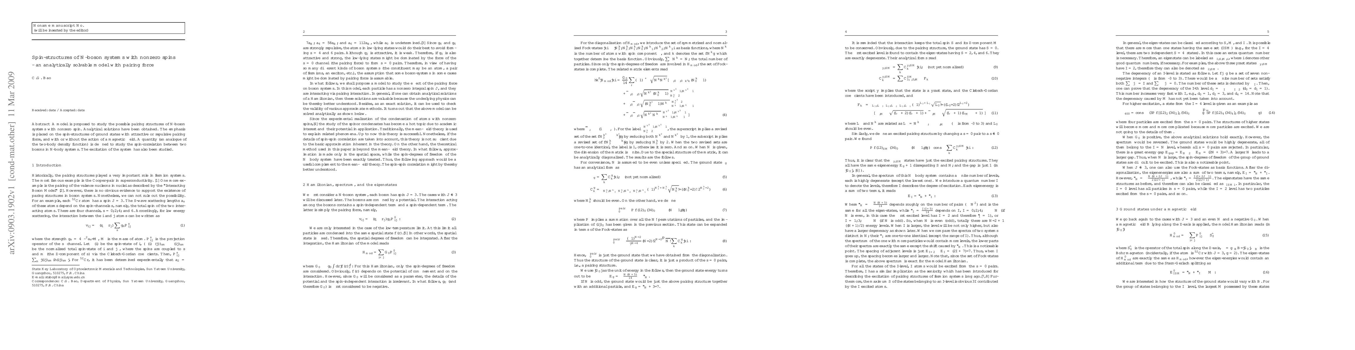 A model is proposed to study the possible pairing structures of N-boson systems with nonzero spin. Analytical solutions have been obtained. The emphasis is placed on the spin-structures of ground states with attractive or repulsive pairing force, and with or without the action of a magnetic field. A quantity (an analogue of the two-body density function) is defined to study the spin-correlation between two bosons in N-body systems. The excitation of the system has also been studied.