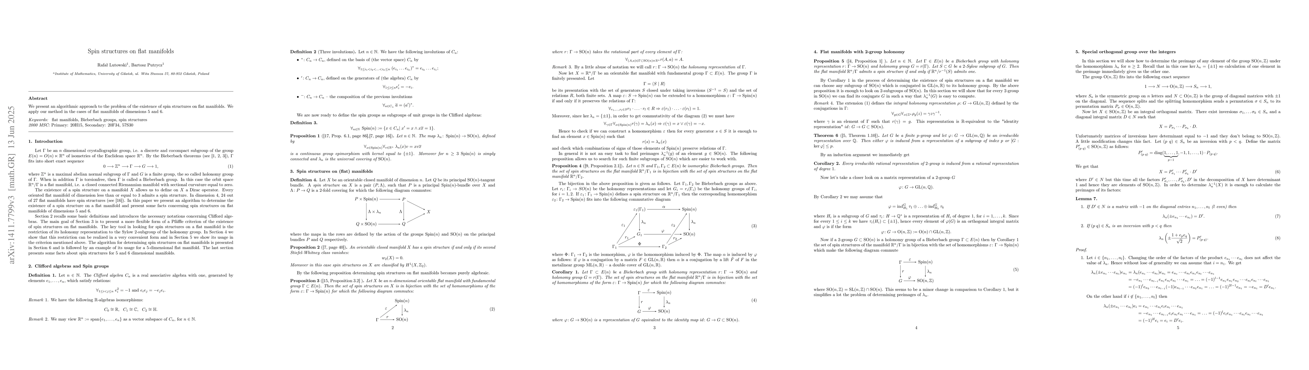 This paper proposes an algorithmic method to determine the existence of spin structures on flat manifolds, specifically applying the approach to dimensions 5 and 6. The results provide insights into the topological properties of these flat manifolds.