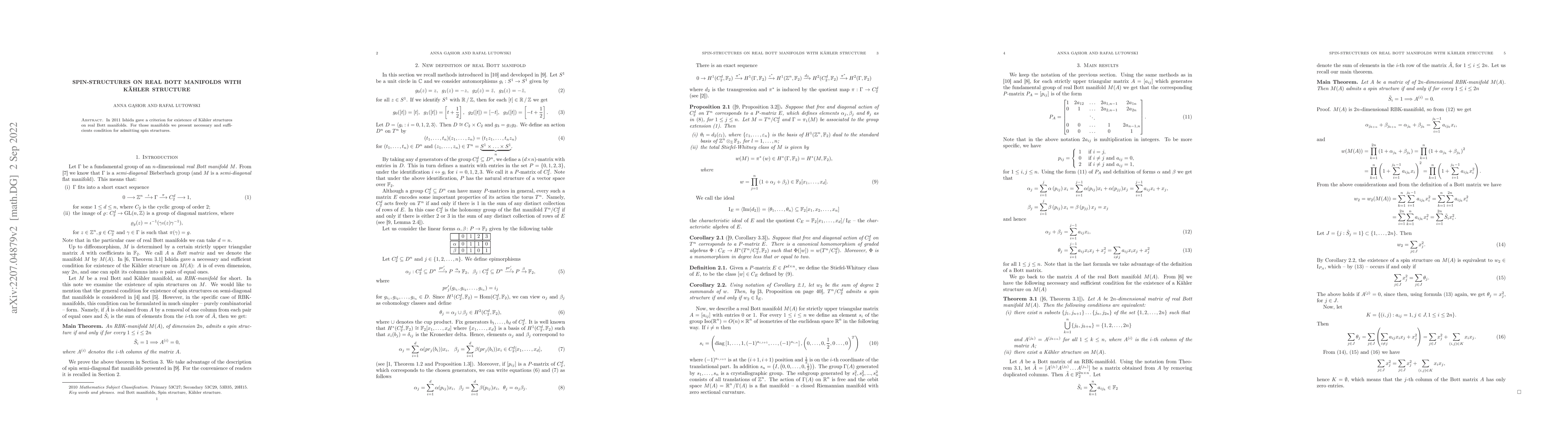 Summary: This paper provides a necessary and sufficient condition for the existence of spin-structures on real Bott manifolds endowed with Kähler structure, utilizing Ishida's characterization and techniques from previous work, along with characteristic classes.