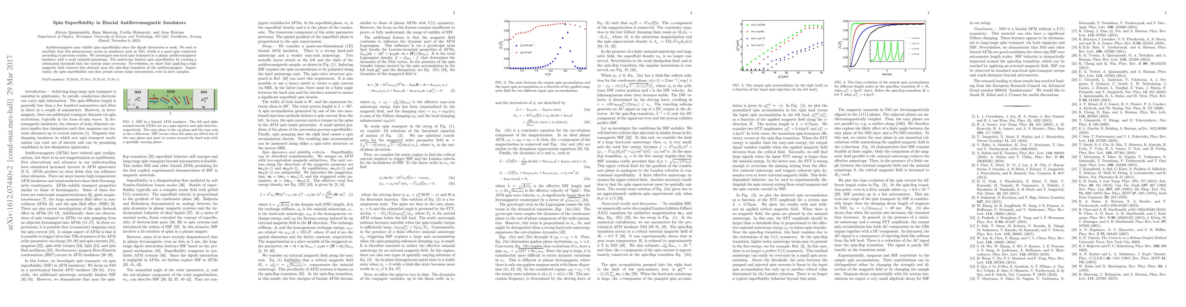 This study explores the occurrence of spin superfluidity in biaxial antiferromagnetic insulators like NiO, demonstrating that high magnetic fields can overcome the threshold imposed by weak uniaxial anisotropy, enabling the phenomenon to persist over micrometer scales despite sample imperfections.