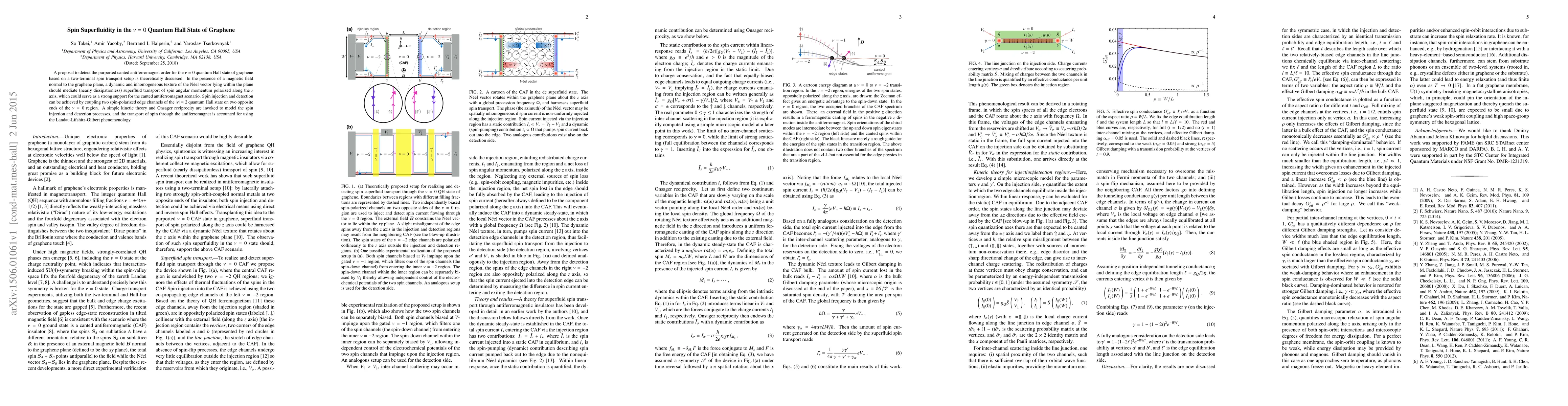 This paper proposes a method to detect spin superfluidity in the $\nu=0$ quantum Hall state of graphene, suggesting that a dynamic texture of the N\'eel vector can mediate nearly dissipationless spin transport. The detection involves spin injection and detection through edge channels of the $|\nu|=2$ quantum Hall state, modeled using kinetic theory and the Landau-Lifshitz-Gilbert phenomenology.