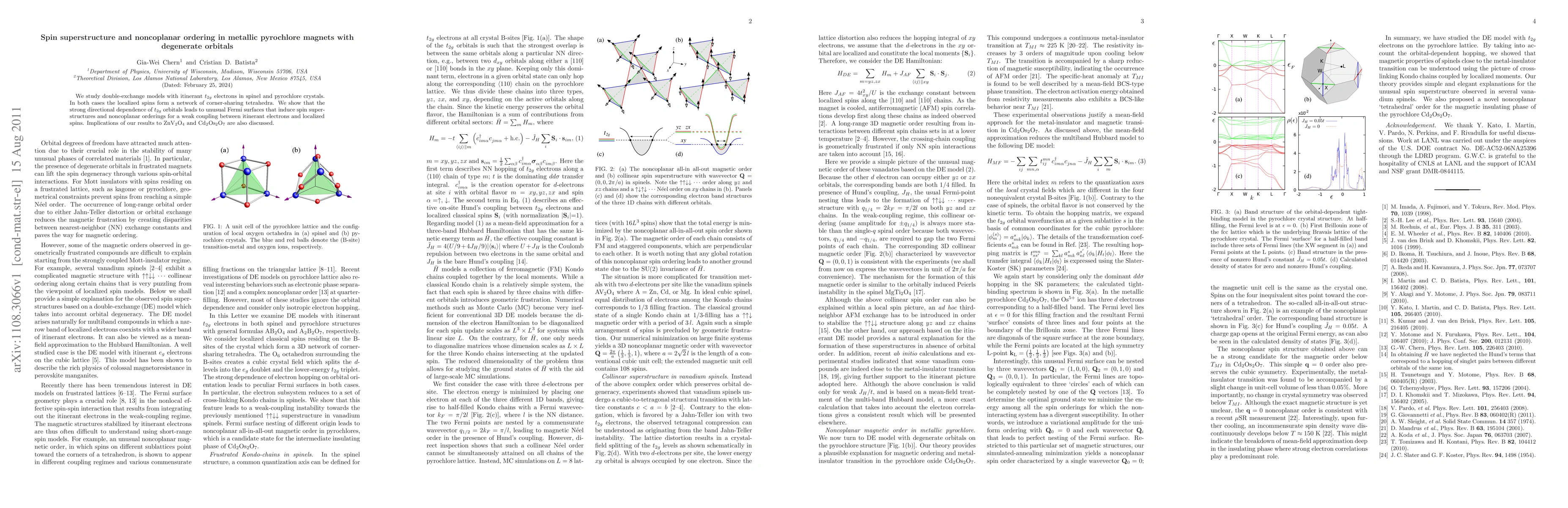 We study double-exchange models with itinerant t2g electrons in spinel and pyrochlore crystals. In both cases the localized spins form a network of corner-sharing tetrahedra. We show that the strong directional dependence of t2g orbitals leads to unusual Fermi surfaces that induce spin superstructures and noncoplanar orderings for a weak coupling between itinerant electrons and localized spins. Implications of our results to ZnV2O4 and Cd2Os2O7 are also discussed.