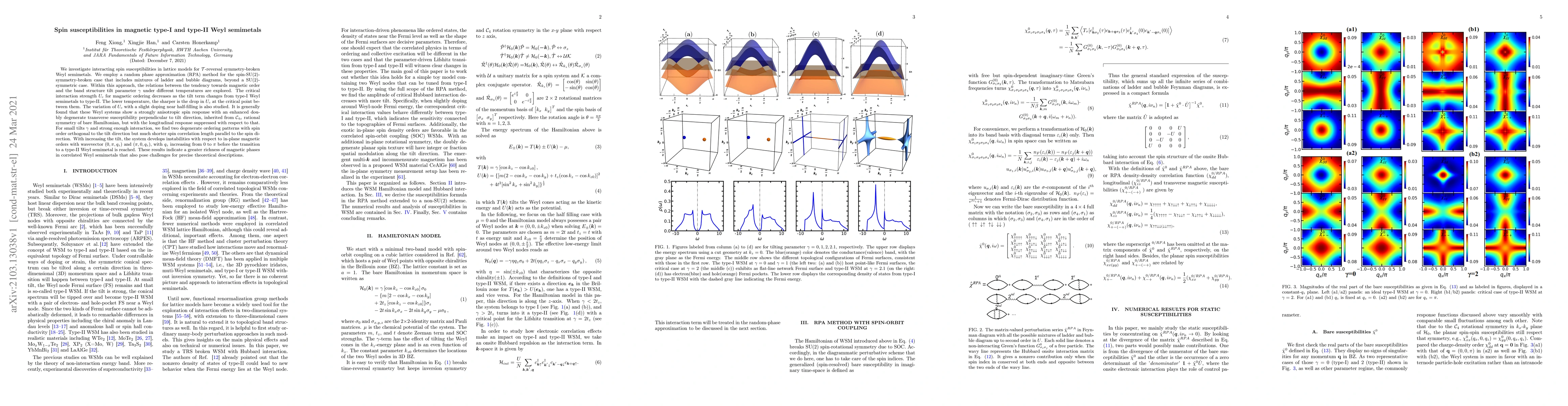 We investigate interacting spin susceptibilities in lattice models for $\mathcal{T}$-reversal symmetry-broken Weyl semimetals. We employ a random phase approximation (RPA) method for the spin-SU(2)-symmetry-broken case that includes mixtures of ladder and bubble diagrams, beyond a SU(2)-symmetric case. Within this approach, the relations between the tendency towards magnetic order and the band structure tilt parameter $\gamma$ under different temperatures are explored. The critical interaction strength $U_c$ for magnetic ordering decreases as the tilt term changes from type-I Weyl semimetals to type-II. The lower temperature, the sharper is the drop in $U_c$ at the critical point between them. The variation of $U_c$ with a slight doping near half-filling is also studied. It is generally found that these Weyl systems show a strongly anisotropic spin response with an enhanced doubly degenerate transverse susceptibility perpendicular to tilt direction, inherited from $\mathcal{C}_{4z}$ rational symmetry of bare Hamiltonian, but with the longitudinal response suppressed with respect to that. For small tilts $\gamma$ and strong enough interaction, we find two degenerate ordering patterns with spin order orthogonal to the tilt direction but much shorter spin correlation length parallel to the spin direction. With increasing the tilt, the system develops instabilities with respect to in-plane magnetic orders with wavevector $(0,\pi, q_z)$ and $(\pi,0, q_z)$, with $q_z$ increasing from 0 to $\pi$ before the transition to a type-II Weyl semimetal is reached. These results indicate a greater richness of magnetic phases in correlated Weyl semimetals that also pose challenges for precise theoretical descriptions.