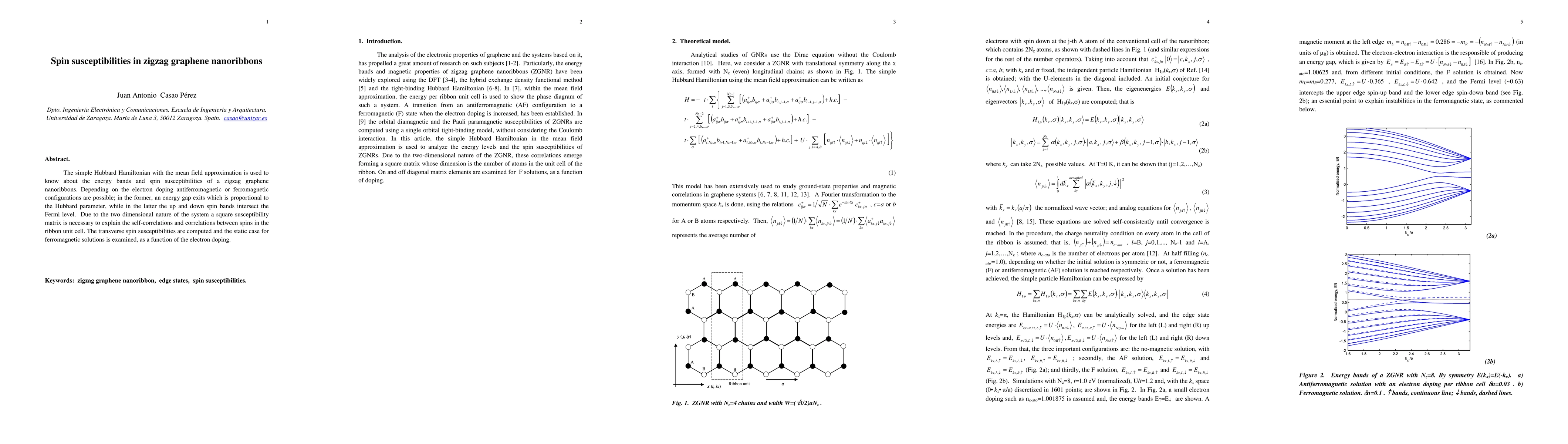The simple Hubbard Hamiltonian with the mean field approximation is used to know about the energy bands and spin susceptibilities of zigzag graphene nanoribbons. Depending on the electron doping, antiferromagnetic or ferromagnetic configurations are possible; in the former, an energy gap exits which is proportional to the Hubbard parameter, while in the latter the up and down spin bands intersect the Fermi level. Due to the two dimensional nature of the system, a susceptibility square matrix is necessary to explain the self-correlations and correlations between spins in the ribbon unit cell. The transverse spin susceptibilities are computed and the static case for ferromagnetic solutions is examined, as a function of the electron doping.