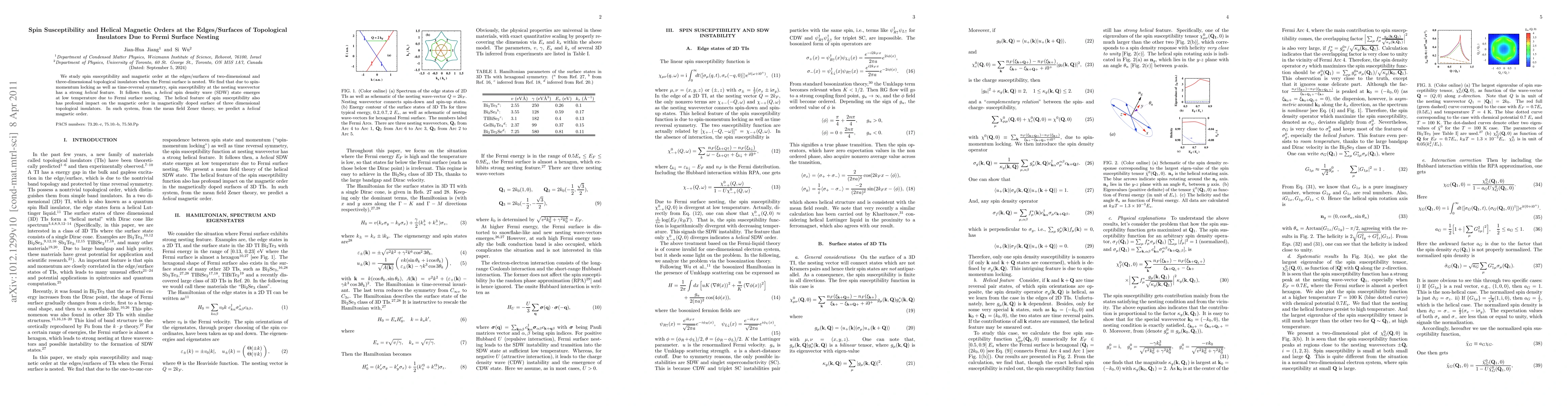 This paper investigates the spin susceptibility and magnetic order at the edges/surfaces of topological insulators with nested Fermi surfaces, revealing a strong helical spin density wave state due to spin-momentum locking and time-reversal symmetry. It predicts helical magnetic order in magnetically doped three-dimensional topological insulators based on mean field Zener theory.