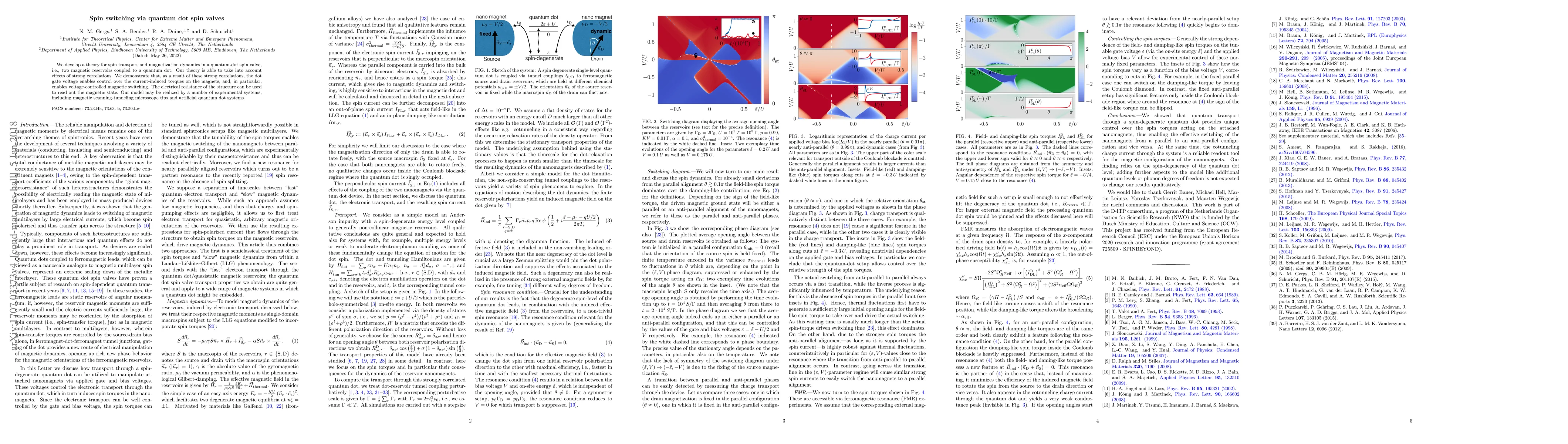 This paper develops a theoretical framework for spin transport and magnetization dynamics in quantum-dot spin valves, showing strong correlation effects enable voltage-controlled magnetic switching via gate voltage. The electrical resistance can be used to read out the magnetic state, with potential experimental realizations in magnetic scanning-tunneling microscope tips and artificial quantum dot systems.