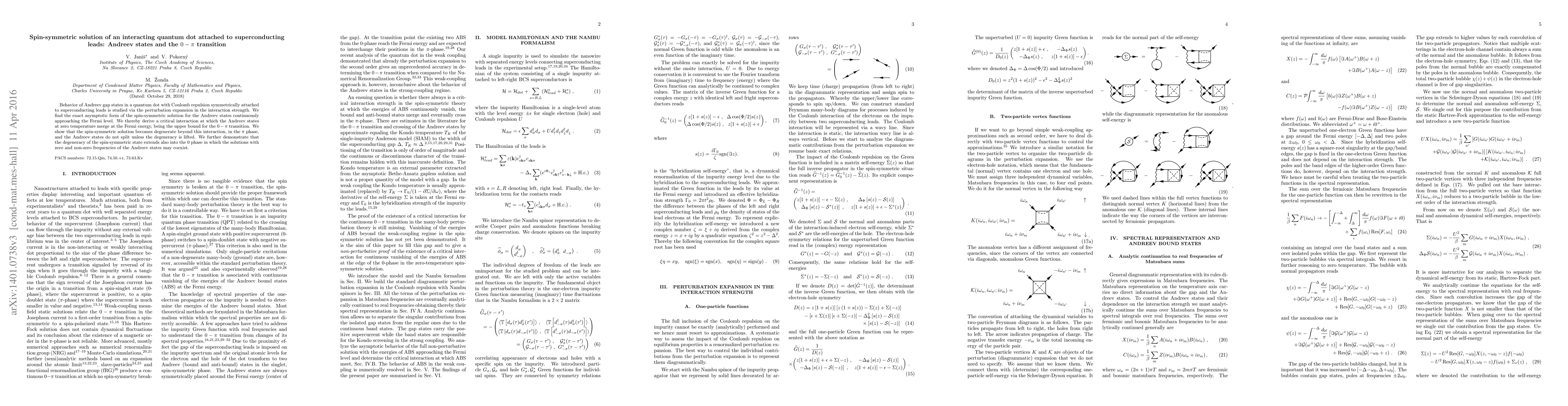 Behavior of Andreev gap states in a quantum dot with Coulomb repulsion symmetrically attached to superconducting leads is studied via the perturbation expansion in the interaction strength. We find the exact asymptotic form of the spin-symmetric solution for the Andreev states continuously approaching the Fermi level. We thereby derive a critical interaction at which the Andreev states at zero temperature merge at the Fermi energy, being the upper bound for the $0-\pi$ transition. We show that the spin-symmetric solution becomes degenerate beyond this interaction, in the $\pi$ phase, and the Andreev states do not split unless the degeneracy is lifted. We further demonstrate that the degeneracy of the spin-symmetric state extends also into the $0$ phase in which the solutions with zero and non-zero frequencies of the Andreev states may coexist.