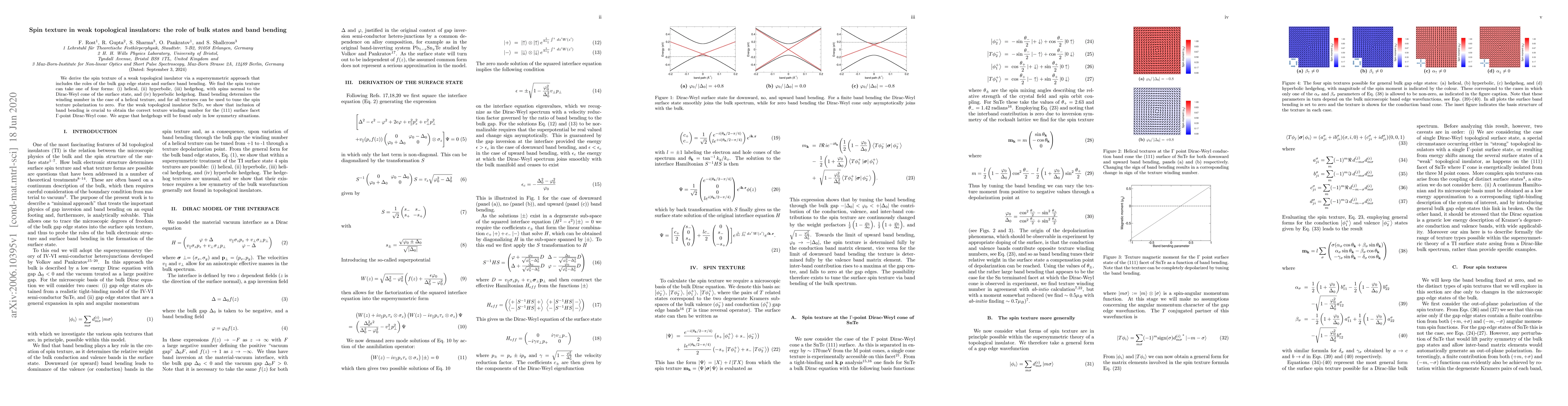 Summary: The paper derives the spin texture of weak topological insulators using a supersymmetric approach, identifying four possible spin textures influenced by bulk states and band bending. For SnTe, band bending is essential for accurately determining the winding number, particularly for the (111) surface facet.