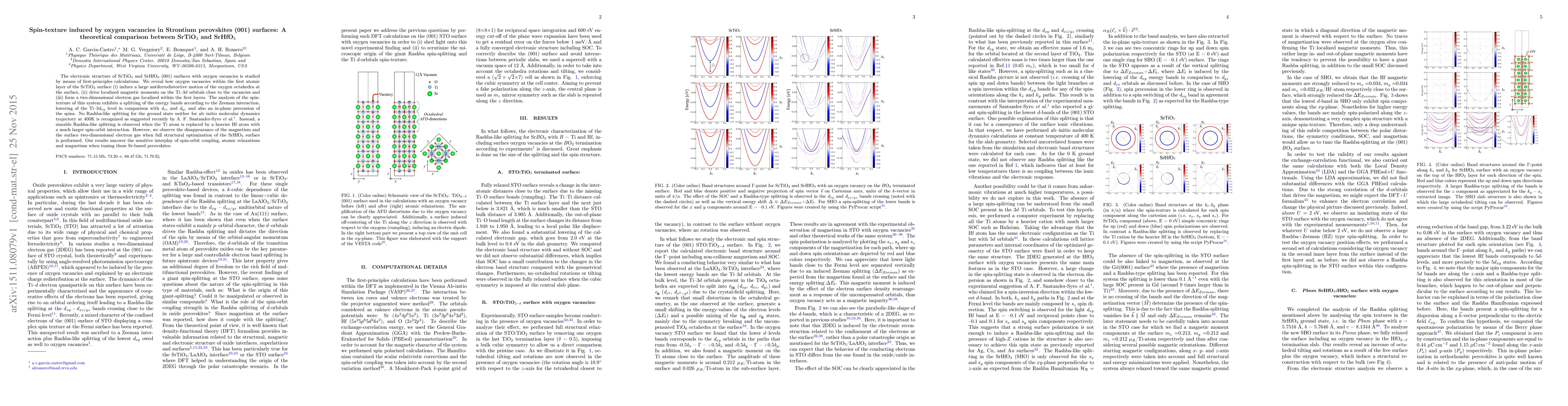 The electronic structure of SrTiO3 and SrHfO3 (001) surfaces with oxygen vacancies is studied by means of first-principles calculations. We reveal how oxygen vacancies within the first atomic layer of the SrTiO3 surface (i) induce a large antiferrodistortive motion of the oxygen octahedra at the surface, (ii) drive localized magnetic moments on the Ti-3d orbitals close to the vacancies and (iii) form a two-dimensional electron gas localized within the first layers. The analysis of the spin-texture of this system exhibits a splitting of the energy bands according to the Zeeman interaction, lowering of the Ti-3dxy level in comparison with dxz and dyz and also an in-plane precession of the spins. No Rashba-like splitting for the ground state neither for ab-initio molecular dynamics trajectory at 400K is recognized as suggested recently by A. F. Santander-Syro et al. [1]. Instead, a sizeable Rashba-like splitting is observed when the Ti atom is replaced by a heavier Hf atom with a much larger spin-orbit interaction. However, we observe the disappearance of the magnetism and the surface two dimensional electron gas when full structural optimization of the SrHfO3 surface is performed. Our results uncover the sensitive interplay of spin-orbit coupling, atomic relaxations and magnetism when tuning these Sr-based perovskites.