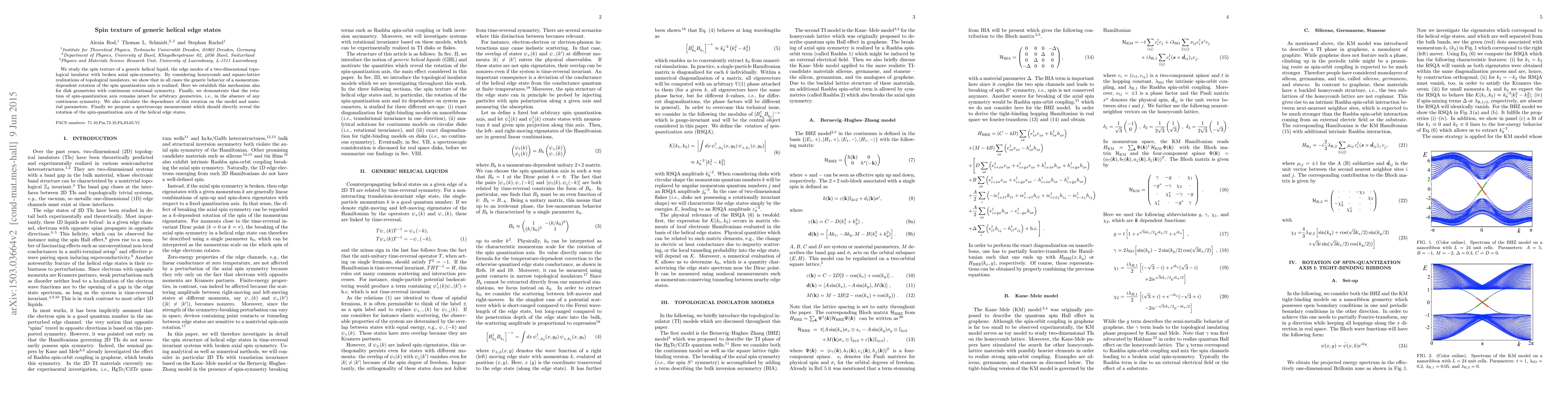 This paper investigates the spin texture of edge states in generic helical liquids, specifically in two-dimensional topological insulators with broken axial spin-symmetry. It demonstrates a momentum-dependent rotation of the spin quantization axis in various lattice realizations and proposes a spectroscopy method to directly observe this phenomenon.