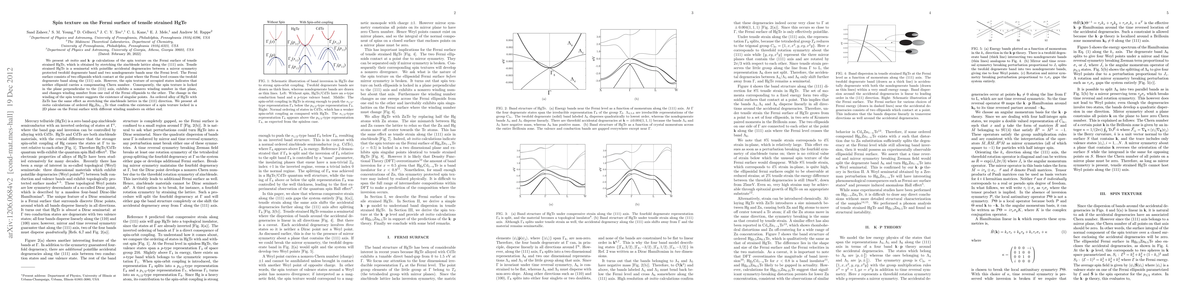 We present ab initio and k.p calculations of the spin texture on the Fermi surface of tensile strained HgTe, which is obtained by stretching the zincblende lattice along the (111) axis. Tensile strained HgTe is a semimetal with pointlike accidental degeneracies between a mirror symmetry protected twofold degenerate band and two nondegenerate bands near the Fermi level. The Fermi surface consists of two ellipsoids which contact at the point where the Fermi level crosses the twofold degenerate band along the (111) axis. However, the spin texture of occupied states indicates that neither ellipsoid carries a compensating Chern number. Consequently, the spin texture is locked in the plane perpendicular to the (111) axis, exhibits a nonzero winding number in that plane, and changes winding number from one end of the Fermi ellipsoids to the other. The change in the winding of the spin texture suggests the existence of singular points. An ordered alloy of HgTe with ZnTe has the same effect as stretching the zincblende lattice in the (111) direction. We present ab initio calculations of ordered Hg_xZn_1-xTe that confirm the existence of a spin texture locked in a 2D plane on the Fermi surface with different winding numbers on either end.