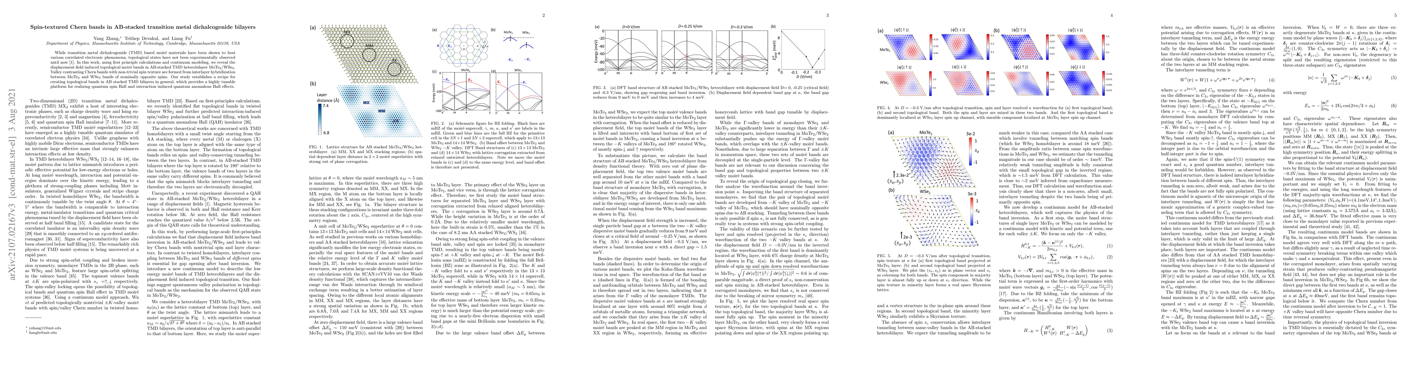This paper reveals topological spin-textured Chern bands in AB-stacked TMD bilayers using first principles calculations and modeling, demonstrating the first experimental observation of such states in MoTe2/WSe2. The study provides a method for creating topological bands in TMD bilayers, offering a tunable platform for quantum spin Hall and quantum anomalous Hall effects.