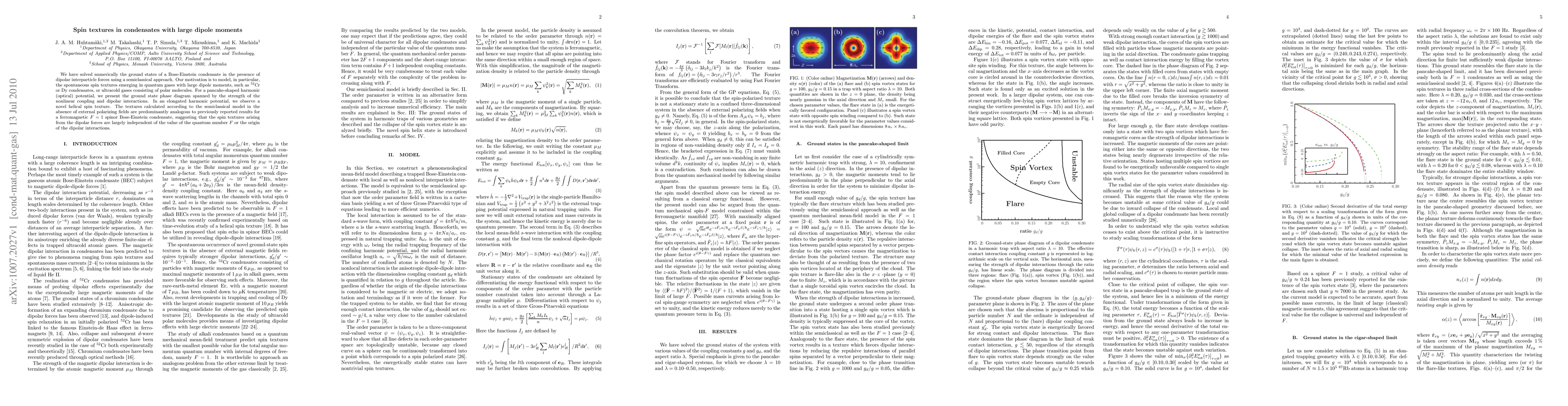 We have solved numerically the ground states of a Bose-Einstein condensate in the presence of dipolar interparticle forces using a semiclassical approach. Our motivation is to model, in particular, the spontaneous spin textures emerging in quantum gases with large dipole moments, such as 52Cr or Dy condensates, or ultracold gases consisting of polar molecules. For a pancake-shaped harmonic (optical) potential, we present the ground state phase diagram spanned by the strength of the nonlinear coupling and dipolar interactions. In an elongated harmonic potential, we observe a novel helical spin texture. The textures calculated according to the semiclassical model in the absence of external polarizing fields are predominantly analogous to previously reported results for a ferromagnetic F = 1 spinor Bose-Einstein condensate, suggesting that the spin textures arising from the dipolar forces are largely independent of the value of the quantum number F or the origin of the dipolar interactions.