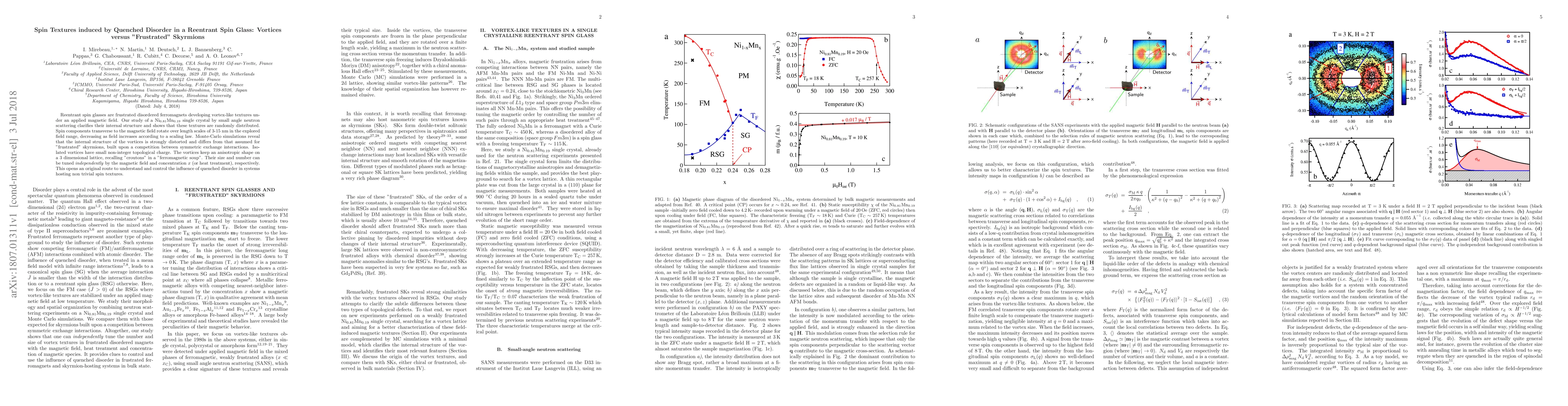 Reentrant spin glasses are frustrated disordered ferromagnets developing vortex-like textures under an applied magnetic field. Our study of a Ni$_{0.81}$Mn$_{0.19}$ single crystal by small angle neutron scattering clarifies their internal structure and shows that these textures are randomly distributed. Spin components transverse to the magnetic field rotate over length scales of 3-15 nm in the explored field range, decreasing as field increases according to a scaling law. Monte-Carlo simulations reveal that the internal structure of the vortices is strongly distorted and differs from that assumed for "frustrated" skyrmions, built upon a competition between symmetric exchange interactions. Isolated vortices have small non-integer topological charge. The vortices keep an anisotropic shape on a 3 dimensional lattice, recalling "croutons" in a "ferromagnetic soup". Their size and number can be tuned independently by the magnetic field and concentration x (or heat treatment), respectively. This opens an original route to understand and control the influence of quenched disorder in systems hosting non trivial spin textures.
