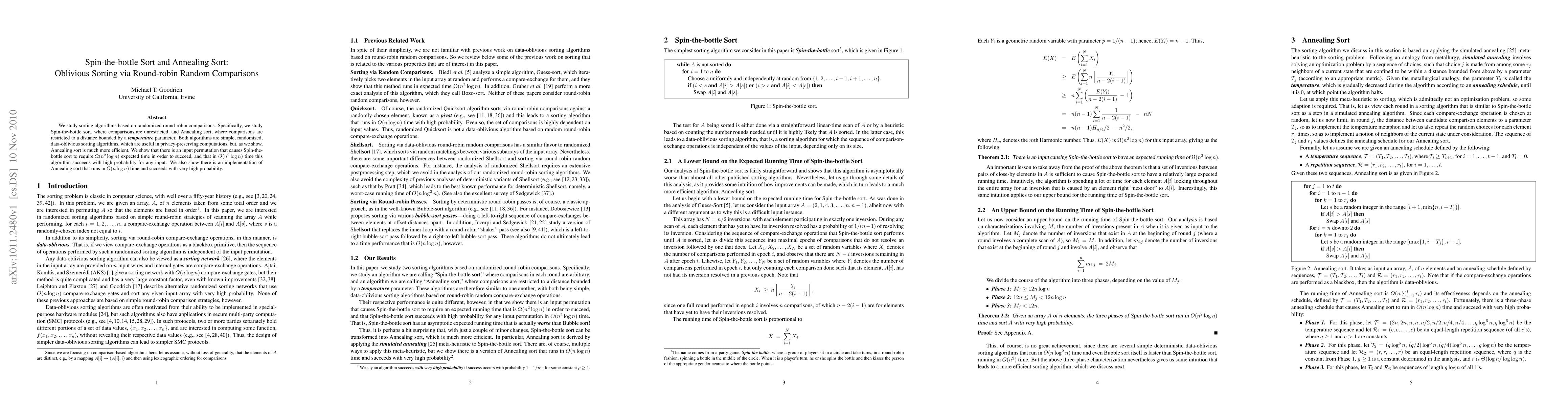 We study sorting algorithms based on randomized round-robin comparisons. Specifically, we study Spin-the-bottle sort, where comparisons are unrestricted, and Annealing sort, where comparisons are restricted to a distance bounded by a \emph{temperature} parameter. Both algorithms are simple, randomized, data-oblivious sorting algorithms, which are useful in privacy-preserving computations, but, as we show, Annealing sort is much more efficient. We show that there is an input permutation that causes Spin-the-bottle sort to require $\Omega(n^2\log n)$ expected time in order to succeed, and that in $O(n^2\log n)$ time this algorithm succeeds with high probability for any input. We also show there is an implementation of Annealing sort that runs in $O(n\log n)$ time and succeeds with very high probability.