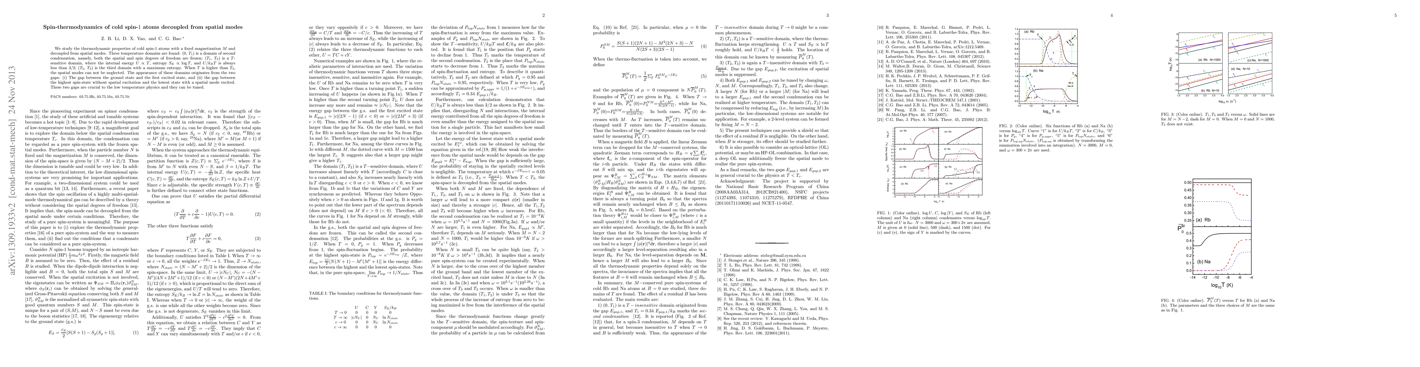 We study the thermodynamic properties of cold spin-1 atoms with a fixed magnetization M and decoupled from spatial modes. Three temperature domains are found: (0, T1) is a domain of second condensation, namely, both the spatial and spin degrees of freedom are frozen; (T1, T2) is a T - sensitive domain, where the internal energy U \propto T, entropy SE \propto log T, and U/kBT is always less than 3/2; (T2, T3) is the third domain with a maximum entropy. When T is higher than T3, the spatial modes can not be neglected. The appearance of these domains originates from the two gaps: (i) The gap between the ground state and the first excited state, and (ii) the gap between the highest spin-state without spatial excitation and the lowest state with a spatial mode excited. These two gaps are crucial to the low temperature physics and they can be tuned.