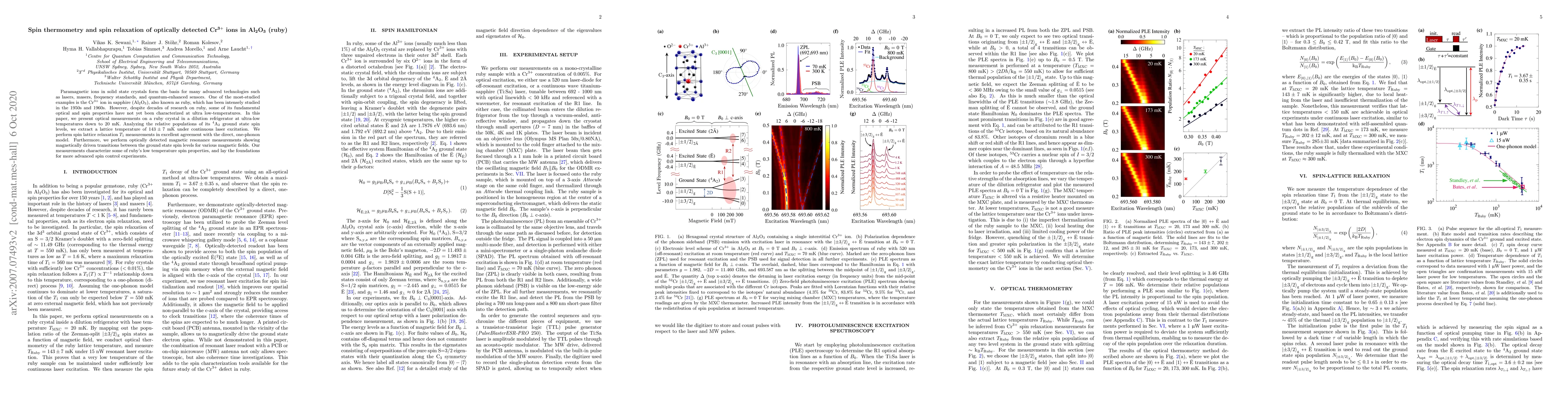Paramagnetic ions in solid state crystals form the basis for many advanced technologies such as lasers, masers, frequency standards, and quantum-enhanced sensors. One of the most-studied examples is the Cr3+ ion in sapphire (Al2O3), also known as ruby, which has been intensely studied in the 1950s and 1960s. However, despite decades of research on ruby, some of its fundamental optical and spin properties have not yet been characterized at ultra low-temperatures. In this paper, we present optical measurements on a ruby crystal in a dilution refrigerator at ultra-low temperatures down to 20 mK. Analyzing the relative populations of its 4A2 ground state spin levels, we extract a lattice temperature of 143(7) mK under continuous laser excitation. We perform spin lattice relaxation T1 measurements in excellent agreement with the direct, one-phonon model. Furthermore, we perform optically detected magnetic resonance measurements showing magnetically driven transitions between the ground state spin levels for various magnetic fields. Our measurements characterize some of ruby's low temperature spin properties, and lay the foundations for more advanced spin control experiments.
