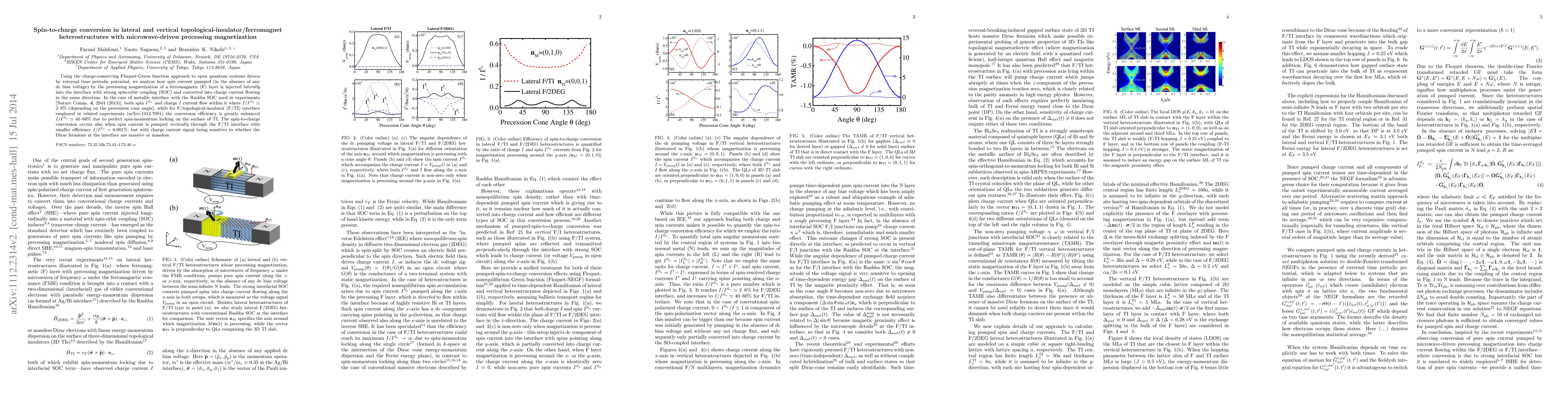 This paper investigates spin-to-charge conversion in topological-insulator/ferromagnet heterostructures driven by microwave-induced magnetization precession. It finds that lateral conversion in metallic interfaces with Rashba SOC yields a 2-8% efficiency, while vertical F/TI interfaces exhibit much higher efficiency (40-60%) due to spin-momentum locking, though vertical conversion is much less efficient (0.001%).