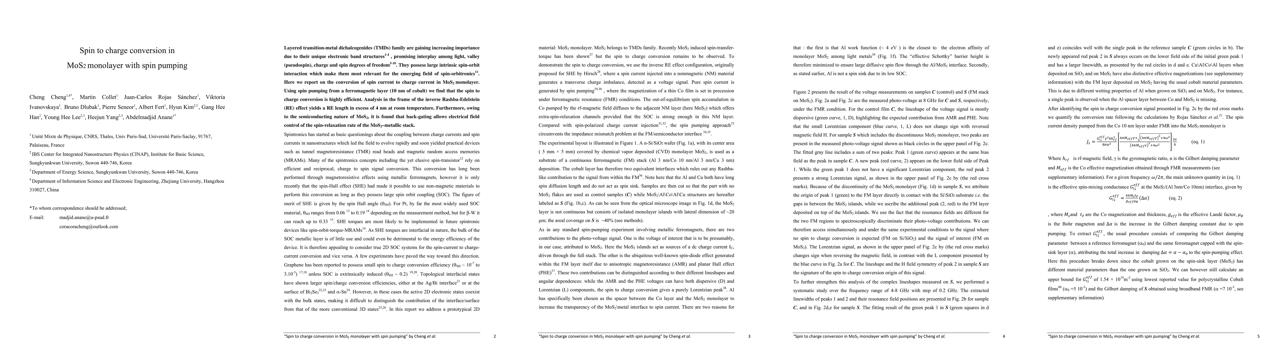 Layered transition-metal dichalcogenides (TMDs) family are gaining increasing importance due to their unique electronic band structures, promising interplay among light, valley (pseudospin), charge and spin degrees of freedom. They possess large intrinsic spin-orbit interaction which make them most relevant for the emerging field of spin-orbitronics. Here we report on the conversion of spin current to charge current in MoS2 monolayer. Using spin pumping from a ferromagnetic layer (10 nm of cobalt) we find that the spin to charge conversion is highly efficient. Analysis in the frame of the inverse Rashba-Edelstein (RE) effect yields a RE length in excess of 4 nm at room temperature. Furthermore, owing to the semiconducting nature of MoS$_{2}$, it is found that back-gating allows electrical field control of the spin-relaxation rate of the MoS$_{2}$-metallic stack.