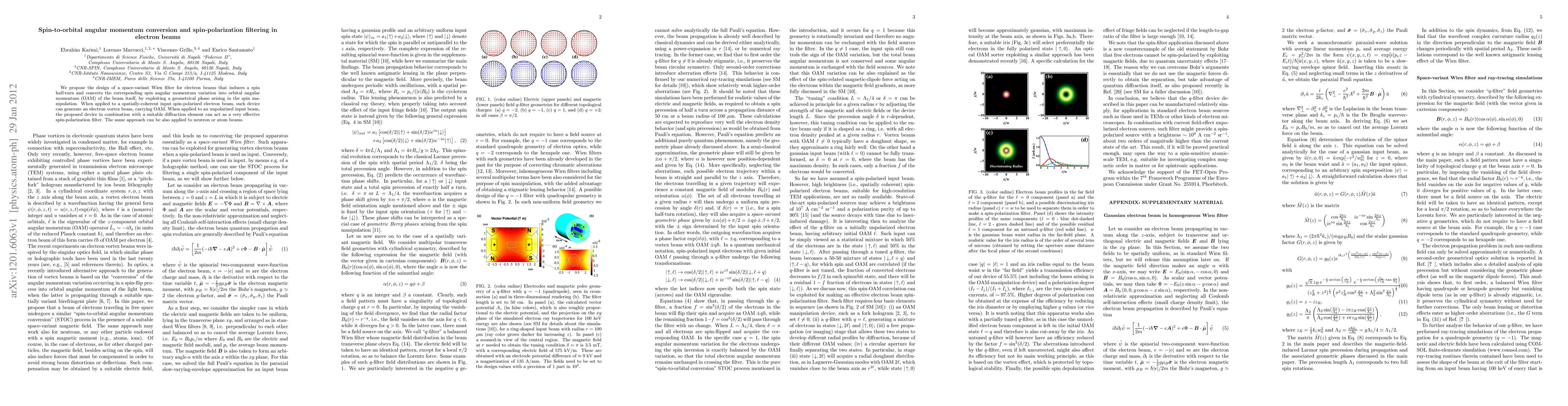 We propose the design of a space-variant Wien filter for electron beams that induces a spin half-turn and converts the corresponding spin angular momentum variation into orbital angular momentum of the beam itself by exploiting a geometrical phase arising in the spin manipulation. When applied to a spatially coherent input spin-polarized electron beam, such a device can generate an electron vortex beam, carrying orbital angular momentum. When applied to an unpolarized input beam, the proposed device, in combination with a suitable diffraction element, can act as a very effective spin-polarization filter. The same approach can also be applied to neutron or atom beams.