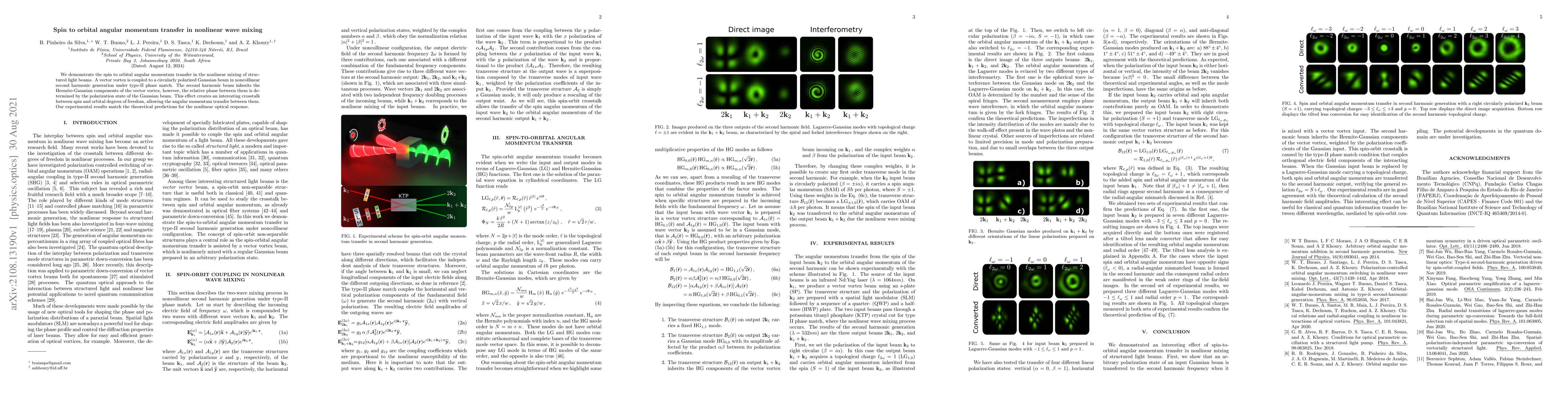 This paper demonstrates spin to orbital angular momentum transfer in nonlinear wave mixing, specifically in noncollinear second harmonic generation. The study shows how a vector vortex interacts with a circularly polarized Gaussian beam, resulting in a second harmonic beam that inherits the vector vortex's Hermite-Gaussian components, with the relative phase influenced by the Gaussian beam's polarization, thus enabling angular momentum transfer between spin and orbital degrees of freedom.