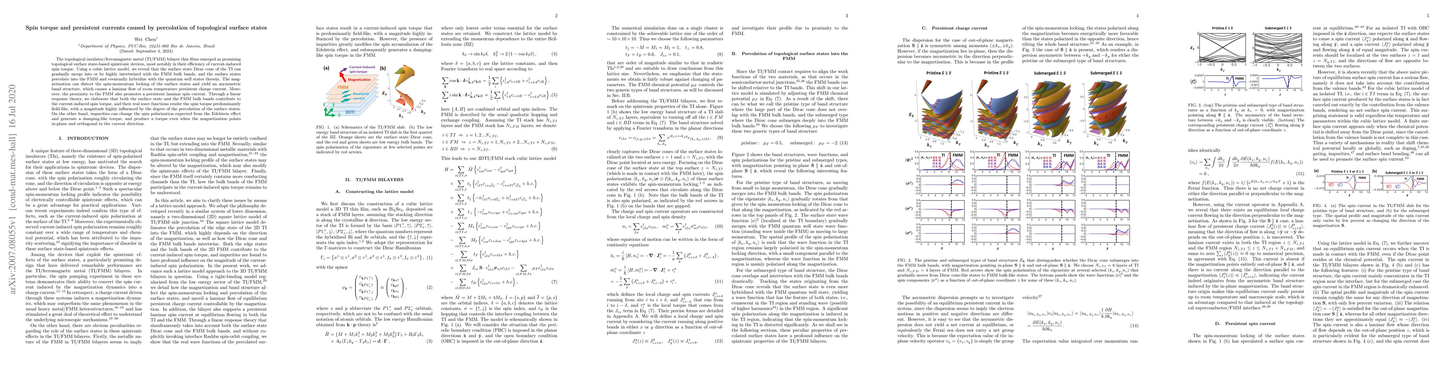 This paper explores the spin torque and persistent currents in TI/FMM bilayer thin films, revealing that topological surface states percolate into the ferromagnetic metal, leading to both charge and spin currents. The study shows that the magnetization distorts spin-momentum locking, causing persistent currents, and the degree of surface state percolation significantly influences the field-like spin torque.