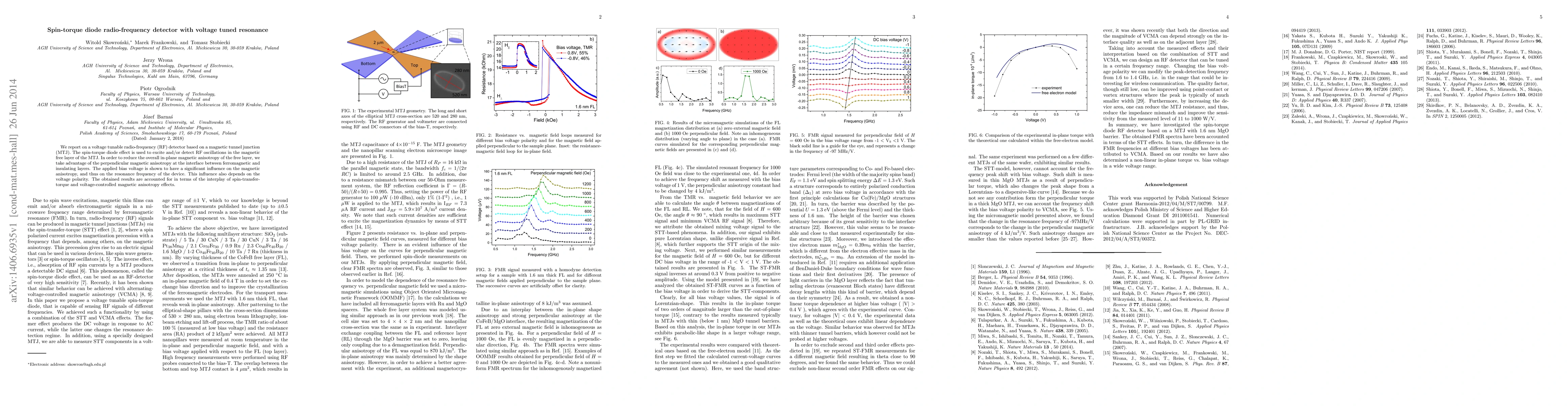 We report on a voltage tunable radio-frequency (RF) detector based on a magnetic tunnel junction (MTJ). The spin-torque diode effect is used to excite and/or detect RF oscillations in the magnetic free layer of the MTJ. In order to reduce the overall in-plane magnetic anisotropy of the free layer, we take advantage of the perpendicular magnetic anisotropy at the interface between ferromagnetic and insulating layers. The applied bias voltage is shown to have a significant influence on the magnetic anisotropy, and thus on the resonance frequency of the device. This influence also depends on the voltage polarity. The obtained results are accounted for in terms of the interplay of spin-transfer-torque and voltage-controlled magnetic anisotropy effects.