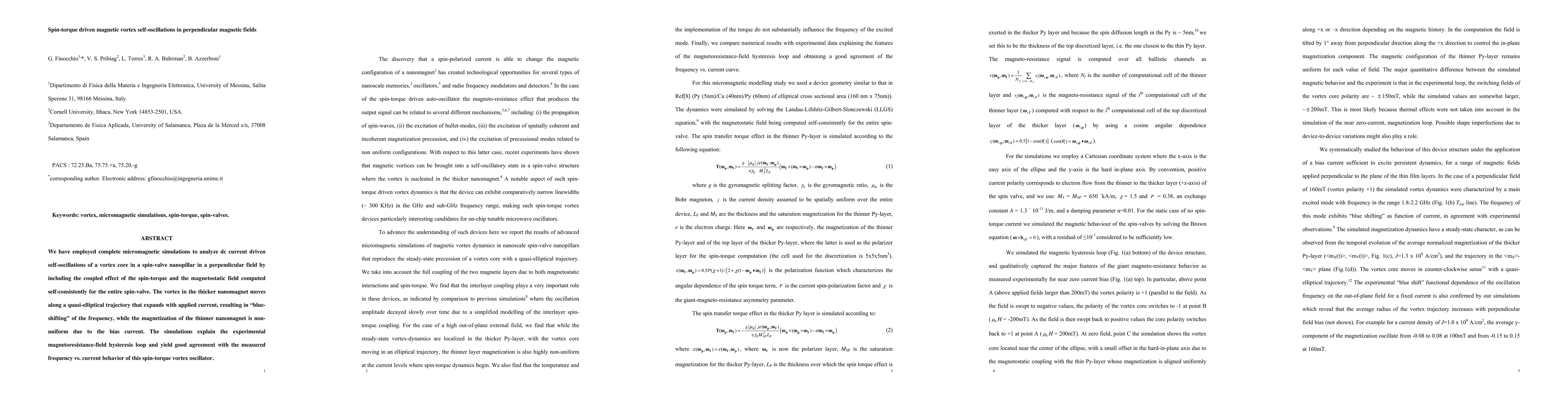 This paper uses micromagnetic simulations to study dc current-driven self-oscillations in a magnetic vortex within a spin-valve nanopillar under perpendicular magnetic fields, revealing a quasi-elliptical trajectory and frequency blue-shifting with current, and correlating well with experimental magnetoresistance-field hysteresis and frequency measurements.