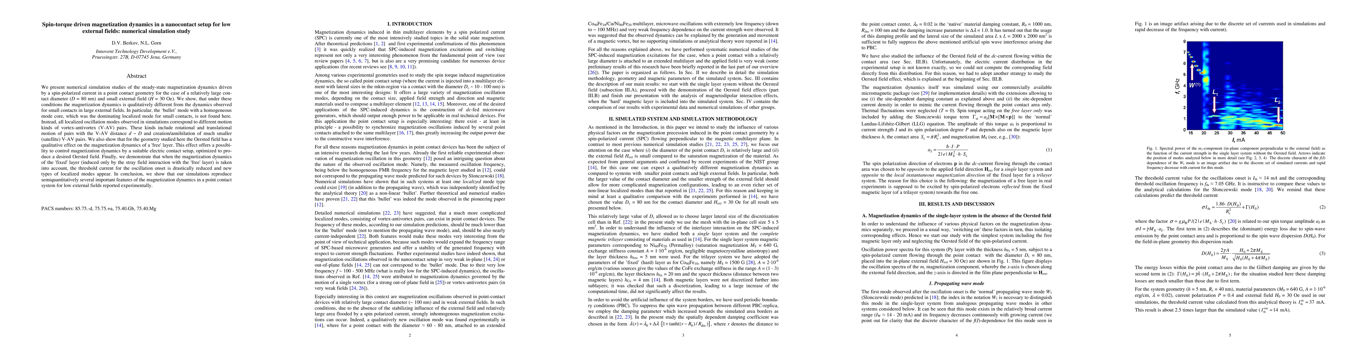 We present numerical simulation studies of the steady-state magnetization dynamics driven by a spin-polarized current in a point contact geometry for the case of a relatively large contact diameter (D = 80 nm) and small external field (H = 30 Oe). We show, that under these conditions the magnetization dynamics is qualitatively different from the dynamics observed for small contacts in large external fields. In particular, the 'bullet' mode with a homogeneous mode core, which was the dominating localized mode for small contacts, is not found here. Instead, all localized oscillation modes observed in simulations correspond to different motion kinds of vortex-antivortex (V-AV) pairs. These kinds include rotational and translational motion of pairs with the V-AV distance d ~ D and creation/annihilation of much smaller (satellite) V-AV pairs. We also show that for the geometry studied here the Oersted field has a qualitative effect on the magnetization dynamics of a 'free' layer. This effect offers a possibility to control magnetization dynamics by a suitable electric contact setup, optimized to produce a desired Oersted field. Finally, we demonstrate that when the magnetization dynamics of the 'fixed' layer (induced only by the stray field interaction with the 'free' layer) is taken into account, the threshold current for the oscillation onset is drastically reduced and new types of localized modes appear. In conclusion, we show that our simulations reproduce semiquantitatively several important features of the magnetization dynamics in a point contact system for low external fields reported experimentally.