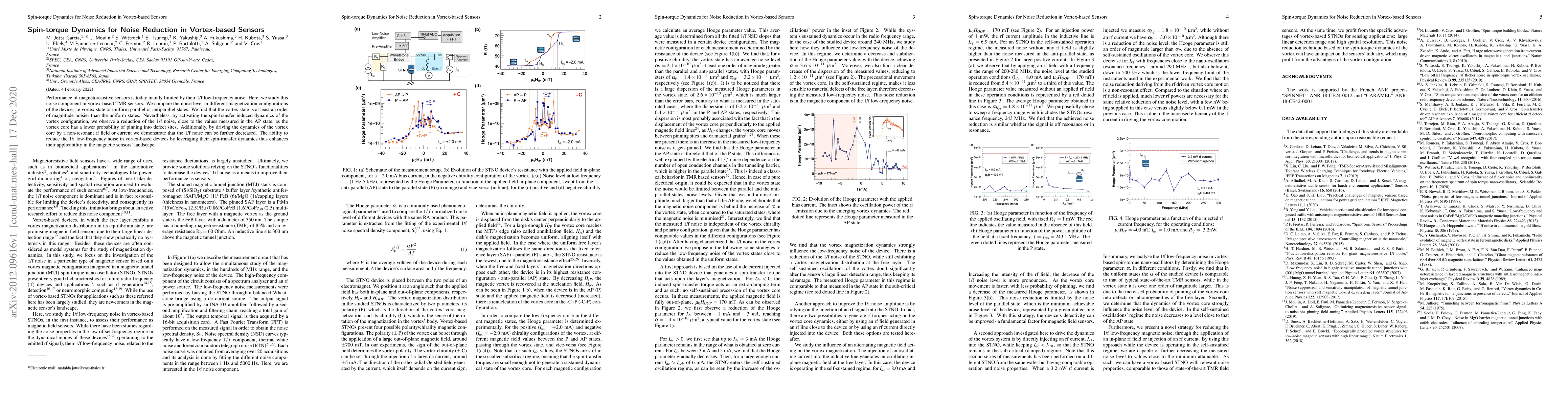This paper investigates the 1/f low-frequency noise in vortex-based TMR sensors, finding that vortex states are significantly noisier than uniform states. By utilizing spin-transfer dynamics to activate vortex configurations, the noise is reduced to levels comparable to antiparallel states, enhancing their potential for magnetic sensor applications.