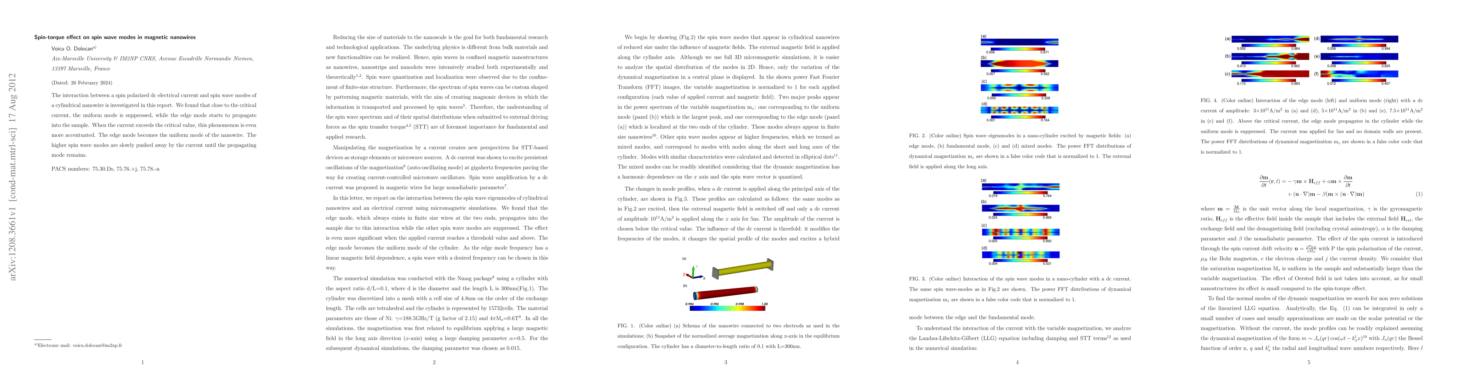 The interaction between a spin polarized dc electrical current and spin wave modes of a cylindrical nanowire is investigated in this report. We found that close to the critical current, the uniform mode is suppressed, while the edge mode starts to propagate into the sample. When the current exceeds the critical value, this phenomenon is even more accentuated. The edge mode becomes the uniform mode of the nanowire. The higher spin wave modes are slowly pushed away by the current until the propagating mode remains.