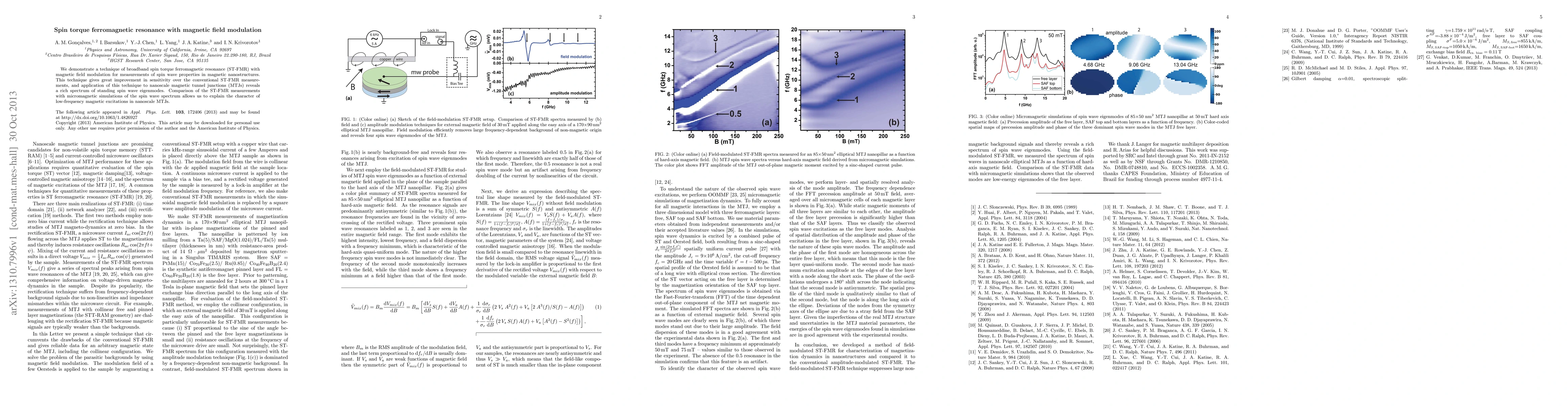 This paper presents a novel technique for broadband spin torque ferromagnetic resonance using magnetic field modulation, which enhances measurement sensitivity and reveals diverse standing spin wave eigenmodes in nanoscale magnetic tunnel junctions. Micromagnetic simulations corroborate the observed low-frequency magnetic excitations.