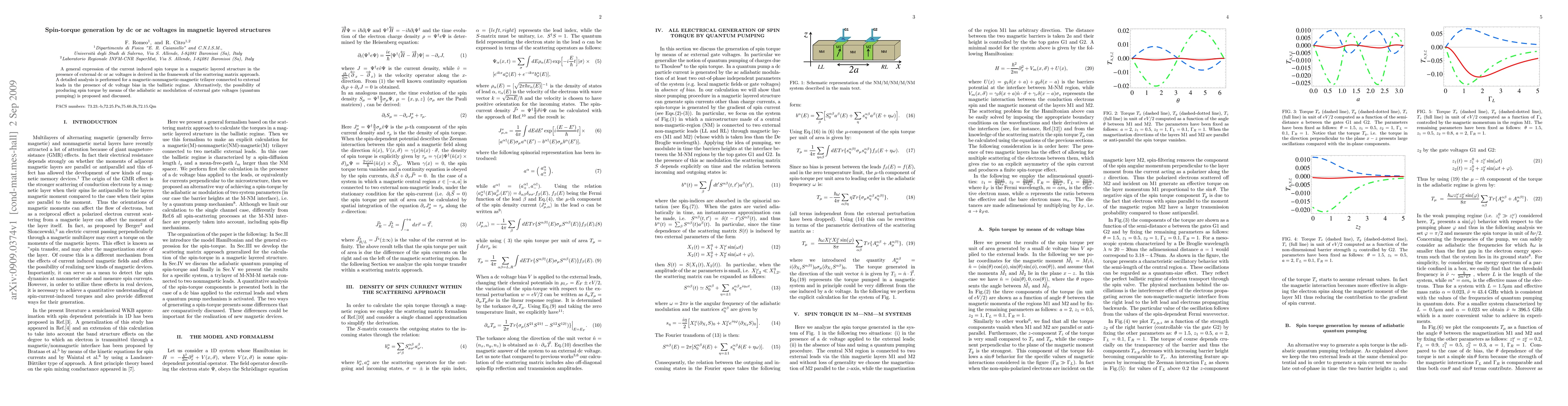 This paper derives a general expression for current-induced spin torque in magnetic layered structures under dc or ac voltages using the scattering matrix approach. It analyzes spin-torque generation in a magnetic-nonmagnetic-magnetic trilayer with dc bias and explores quantum pumping via adiabatic ac modulation of gate voltages.