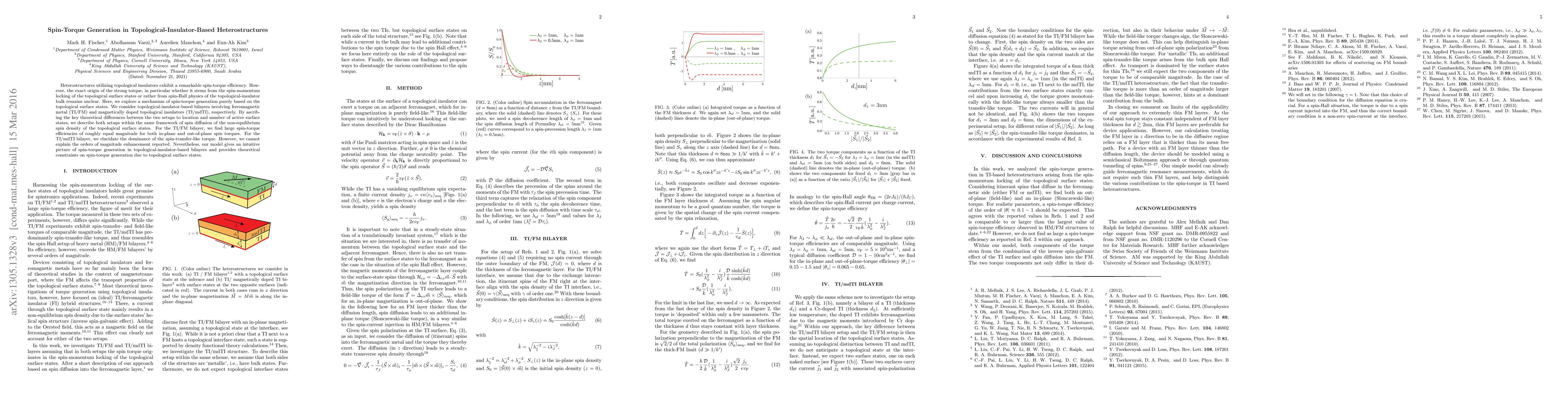 This paper investigates spin-torque generation in topological-insulator-based heterostructures, focusing on the role of topological surface states versus spin-Hall effects. It proposes a unified theoretical framework to describe spin-torque efficiencies in TI/FM and TI/mdTI bilayers, highlighting the dominance of spin-transfer-like torque in the latter.