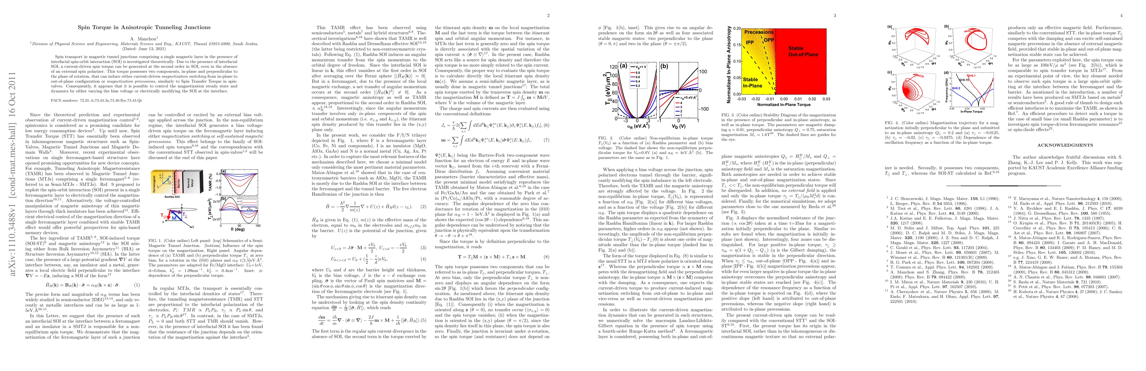 Spin transport in magnetic tunnel junctions comprising a single magnetic layer in the presence of interfacial spin-orbit interaction (SOI) is investigated theoretically. Due to the presence of interfacial SOI, a current-driven spin torque can be generated at the second order in SOI, even in the absence of an external spin polarizer. This torque possesses two components, in-plane and perpendicular to the plane of rotation, that can induce either current-driven {\em magnetization switching} from in-plane to out-of-plane configuration or {\em magnetization precessions}, similarly to Spin Transfer Torque in spin-valves. Consequently, it appears that it is possible to control the magnetization steady state and dynamics by either varying the bias voltage or electrically modifying the SOI at the interface.