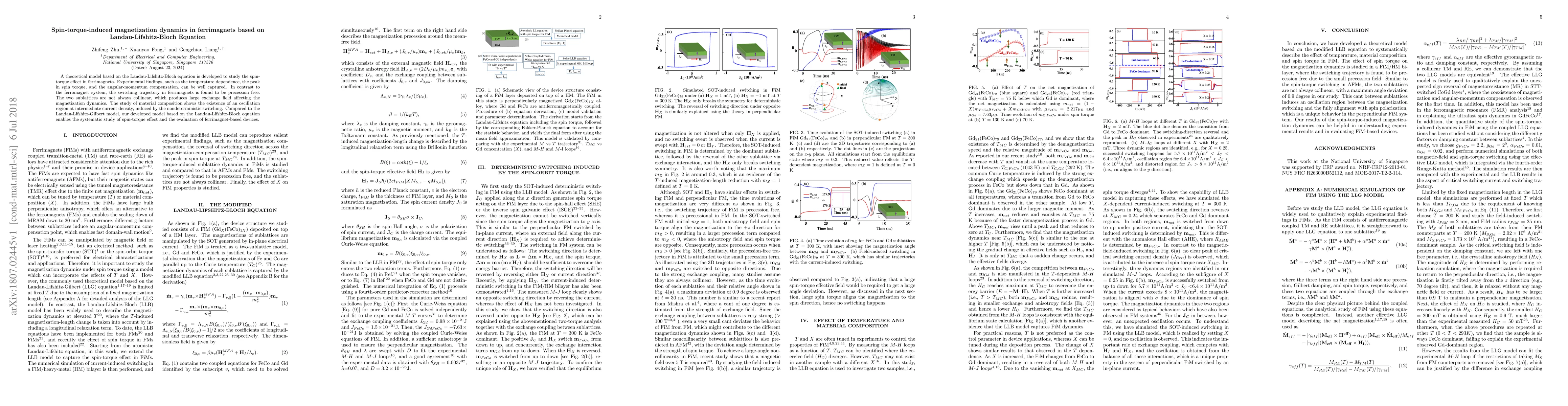 This paper develops a theoretical model using the Landau-Lifshitz-Bloch equation to study spin-torque effects in ferrimagnets, capturing experimental findings like temperature dependence and precession-free switching trajectories. Unlike ferromagnets, ferrimagnets exhibit nondeterministic switching and large exchange fields due to non-collinear sublattices.