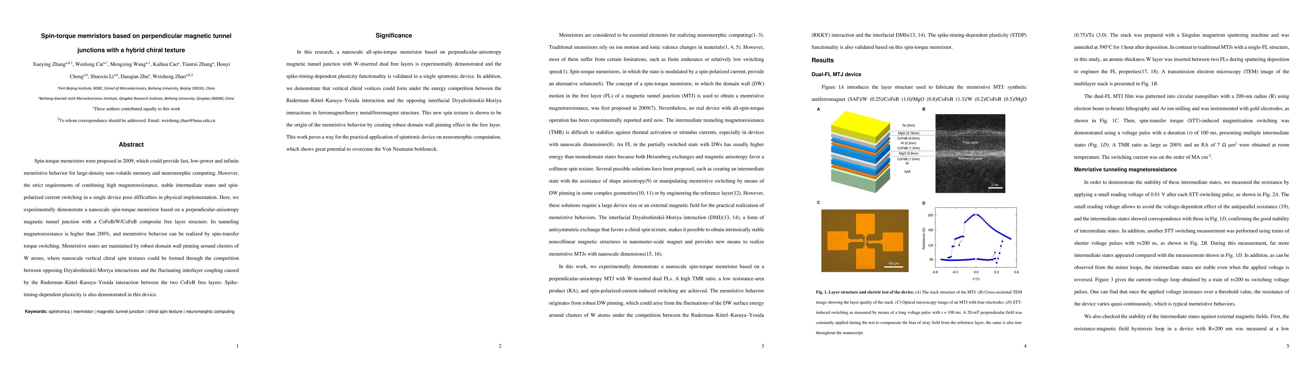 Spin-torque memristors were proposed in 2009, which could provide fast, low-power and infinite memristive behavior for large-density non-volatile memory and neuromorphic computing. However, the strict requirements of combining high magnetoresistance, stable intermediate states and spin-polarized current switching in a single device pose difficulties in physical implementation. Here, we experimentally demonstrate a nanoscale spin-torque memristor based on a perpendicular-anisotropy magnetic tunnel junction with a CoFeB/W/CoFeB composite free layer structure. Its tunneling magnetoresistance is higher than 200%, and memristive behavior can be realized by spin-transfer torque switching. Memristive states are maintained by robust domain wall pinning around clusters of W atoms, where nanoscale vertical chiral spin textures could be formed through the competition between opposing Dzyaloshinskii-Moriya interactions and the fluctuating interlayer coupling caused by the Ruderman-Kittel-Kasuya-Yosida interaction between the two CoFeB free layers. Spike-timing-dependent plasticity is also demonstrated in this device.