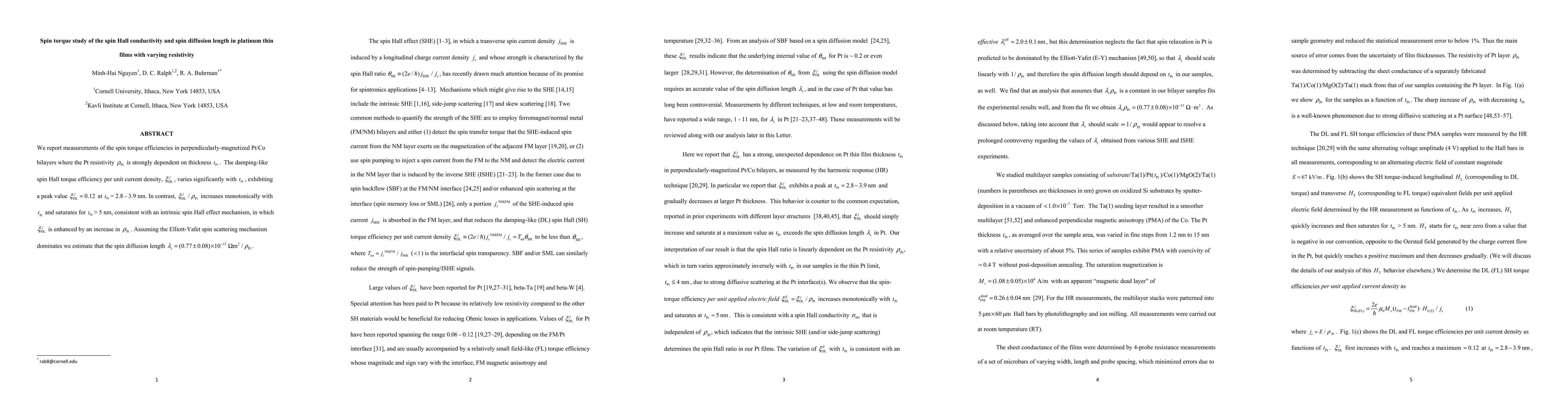 This study investigates the spin torque efficiencies in Pt/Co bilayers with varying Pt thickness, finding a peak in damping-like spin Hall torque efficiency at $t_{Pt} = 2.8 - 3.9$ nm. The efficiency normalized by Pt resistivity increases with Pt thickness, indicating an intrinsic spin Hall effect, and estimates the spin diffusion length as $\lambda_s = (0.77 \pm 0.08) \times 10^{-15} \Omega m^2/\rho_{Pt}$.